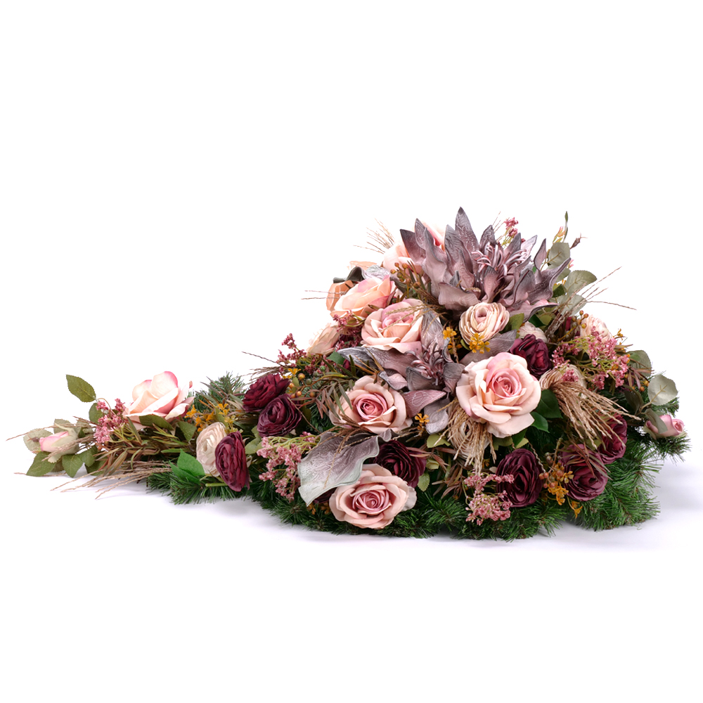 Aranžmán v tvare srdca z umelej čačiny s penovvými a umelými kvetmi jemnej ružovej a bordovej farby.