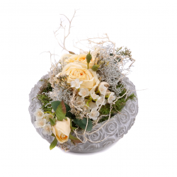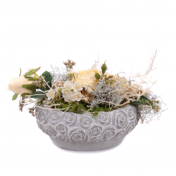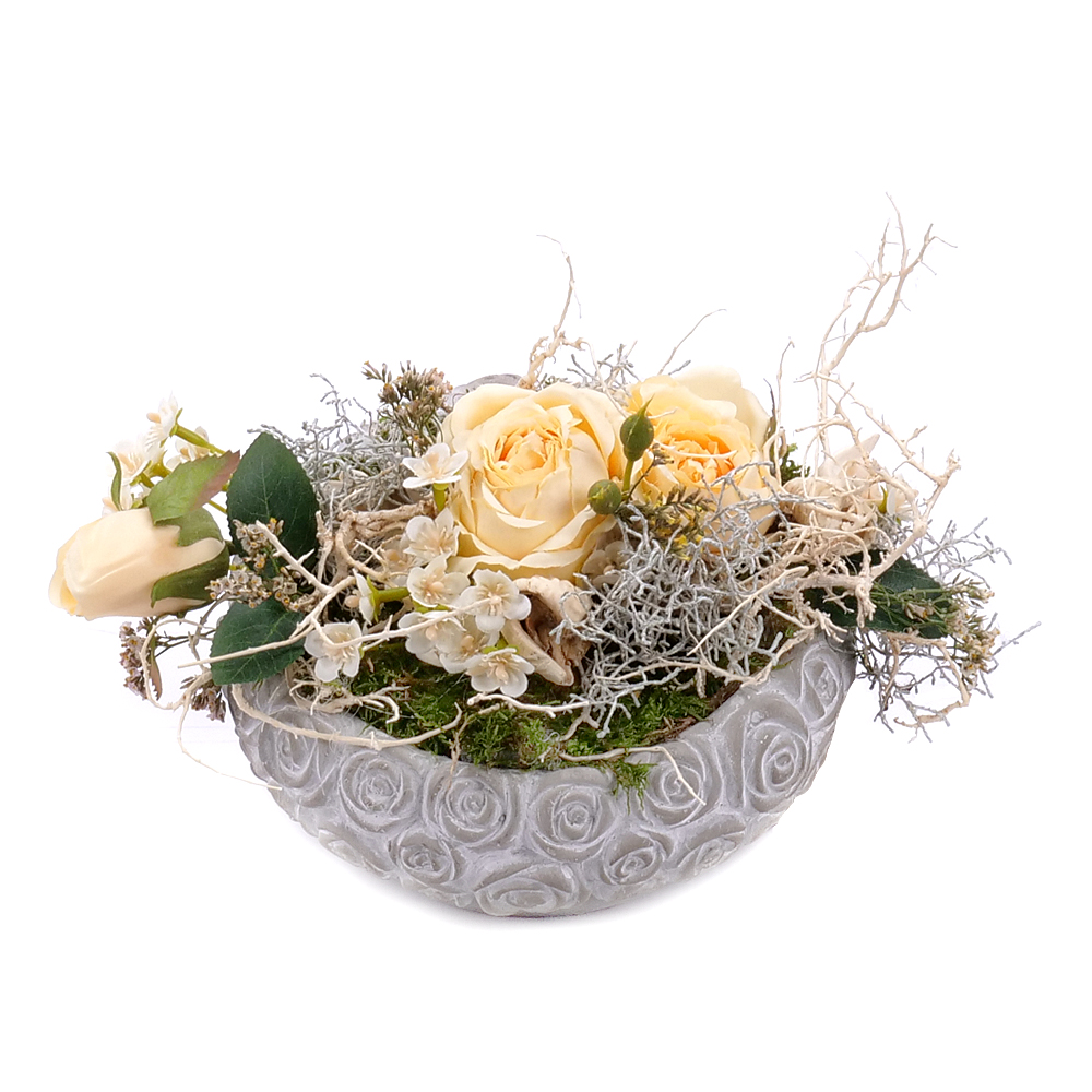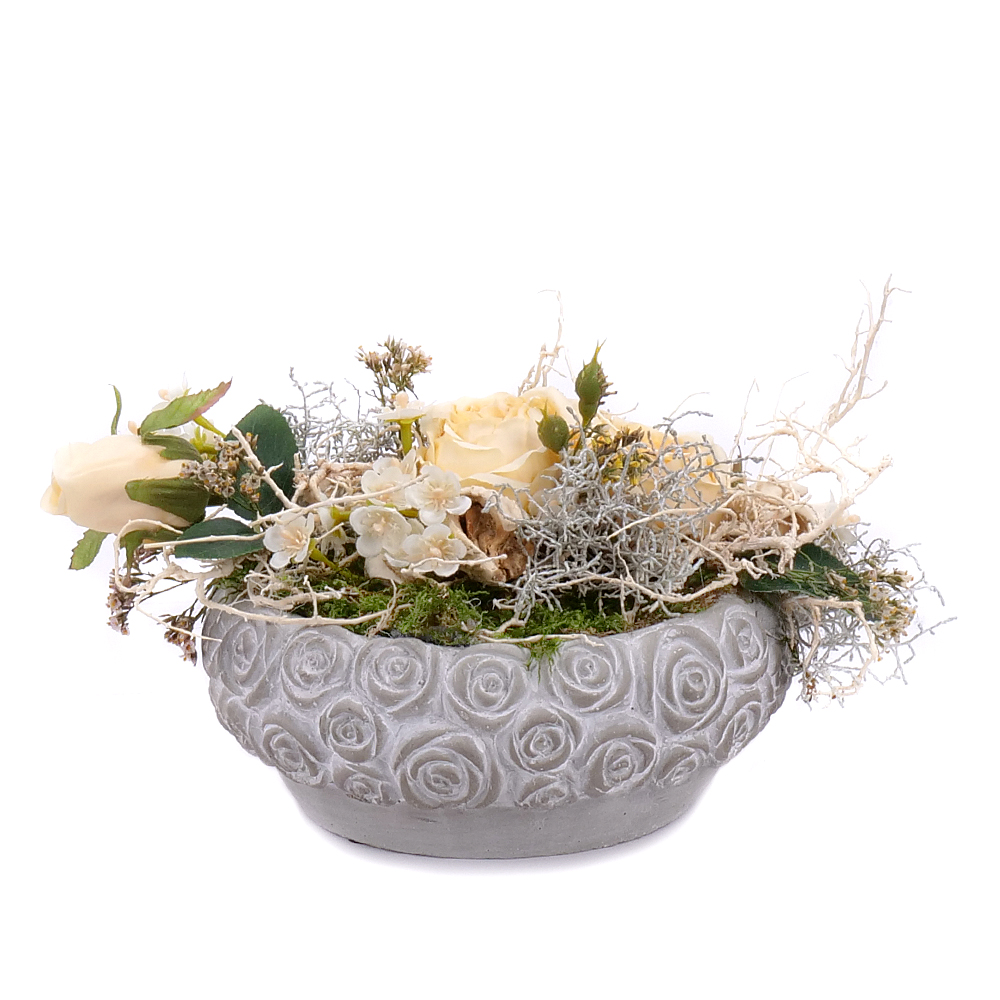 Smútočný aranžmán v keramickej zaťaženej mise šedej farby z betónu s prírodnými doplnkami a umelými kvetmi ruží. Vhodná dekorácia na hrob ako spomienka na Vašich drahých.