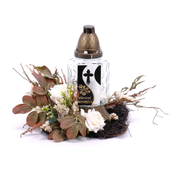 Smútočný aranžmán na prútenom podklade s umelými kvetmi jemnej krémovej farby s prírodnými doplnkami a skleneným kahancom nápisom Milovanej mamičke.