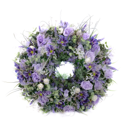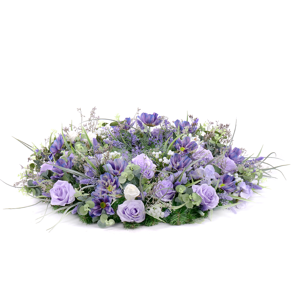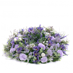 Smútočný umelý veniec v jemných fialových odtieňoch z umelých kvetov a doplnkových materiálov. Vhodný aranžmán na pohreb, hrob alebo ako spomienka na Vašich drahých zosnulých.