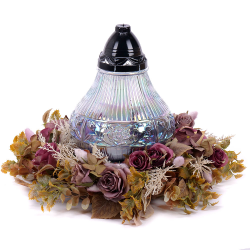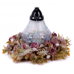 Elegantný smútočný veniec vyrobený z kvalitných umelých kvetov, ktoré verne napodobňujú živé kvety a zároveň zaručujú dlhodobú trvácnosť a odolnosť voči poveternostným vplyvom. Veniec je doplnený o sklenený kahanec, ktorý dotvára pietny charakter aranžmánu.