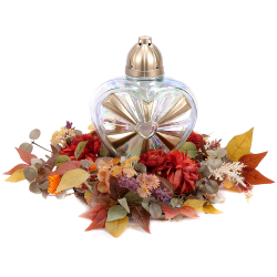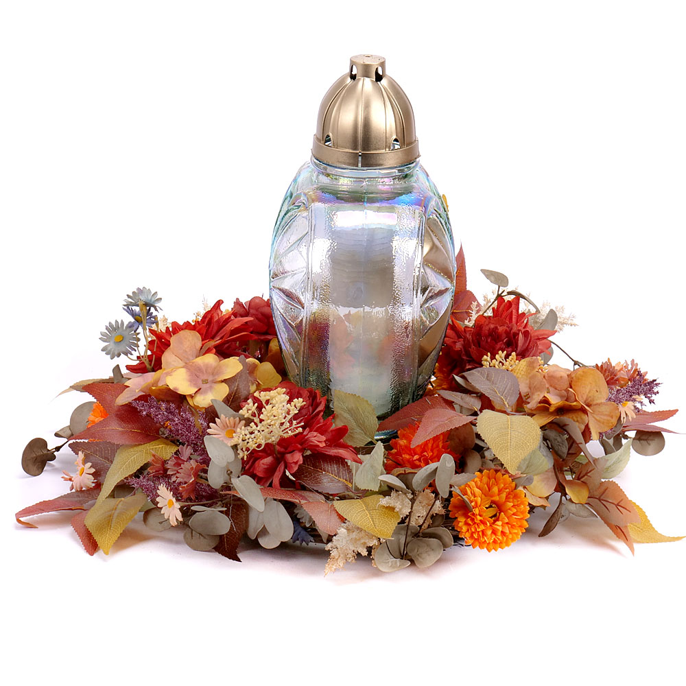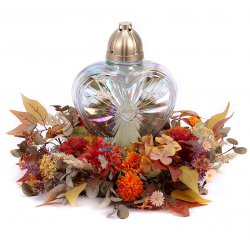 Elegantný smútočný veniec z kvalitných umelých kvetov a zelene, doplnený o sklenený kahanec umiestnený v jeho strede. Tento vkusný aranžmán symbolizuje večné svetlo spomienky a úcty k zosnulým. Kombinácia kvetov, prírodne pôsobiacej zelene a svetla kahanca vytvára dôstojnú a harmonickú kompozíciu. Veniec je vhodný ako celoročná dekorácia na hrob alebo pietne miesto – vďaka trvácnym materiálom si zachová svoj tvar aj farby počas dlhého obdobia.