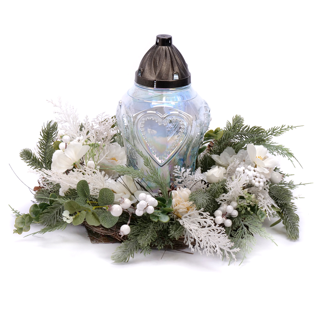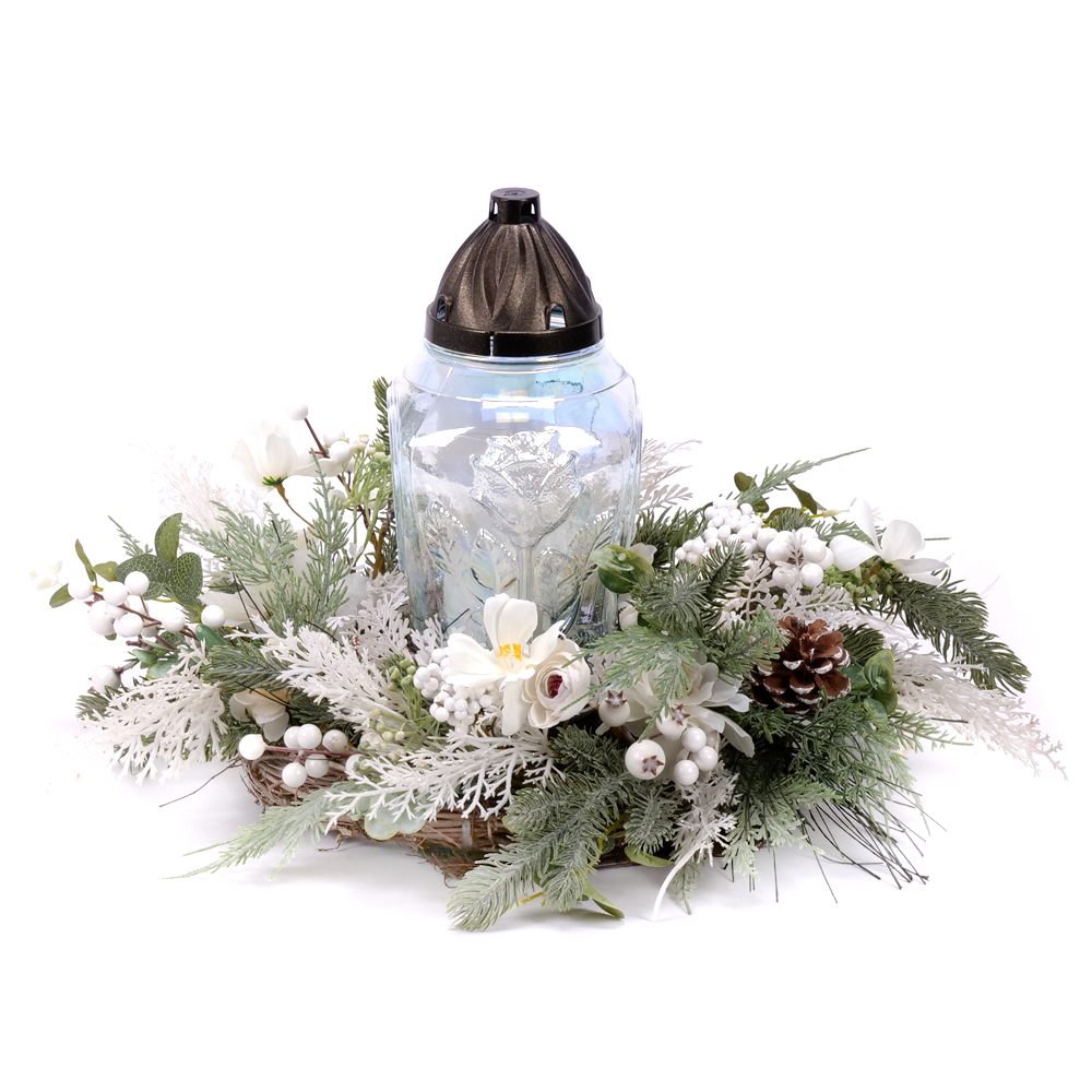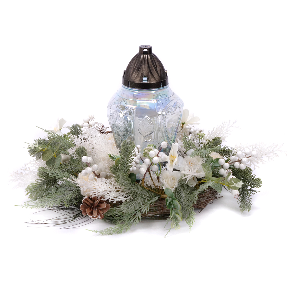 Smútočný umelý veniec so šiškami, bavlnou a umelými kvetmi. Súčasťou je sklenený kahanec uprostred. Vhodná dekorácia na cintorín v zimnom období.