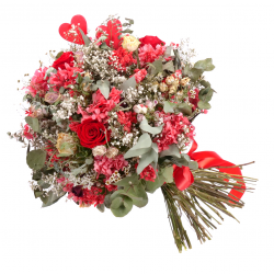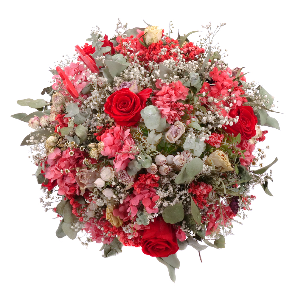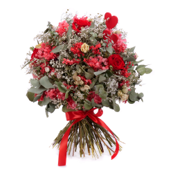 Exkuzívna kytica červenej farby v z In eterno preparovaných ruží, prírodných kvetov a materiálov. ... Viac