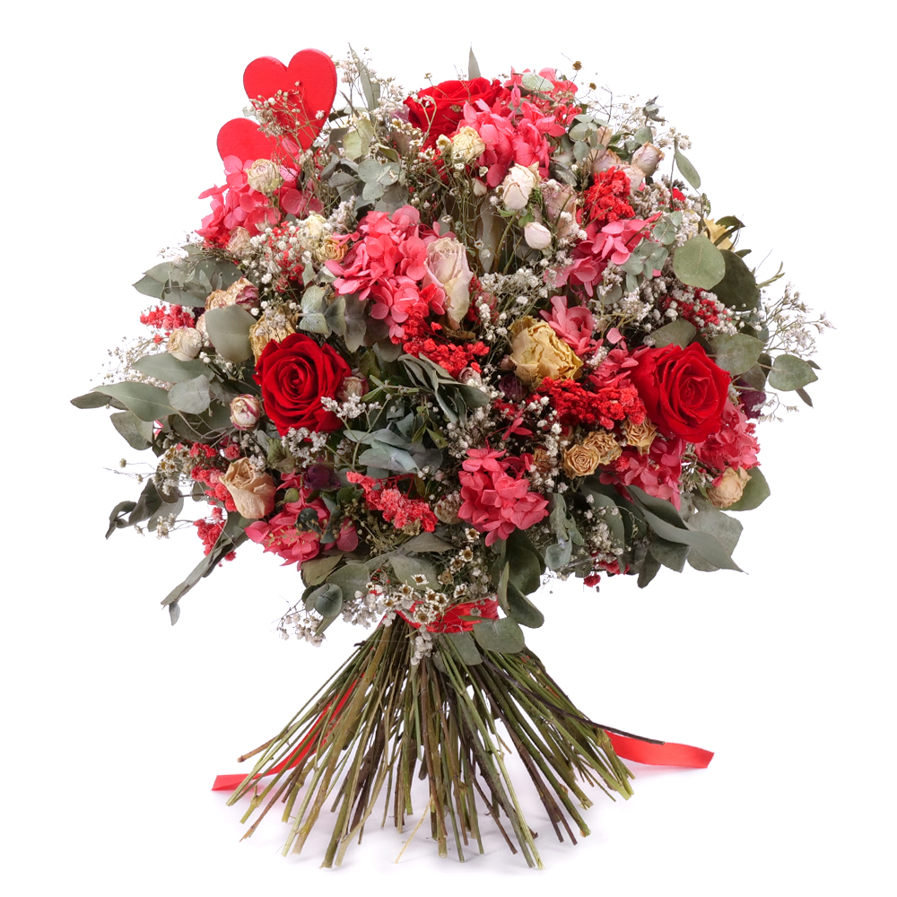 Irigo sušená kytica trsové ruže a preparované červené ruže srdiečka