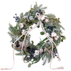 Umelý vianočný veniec na zavesenie alebo položenie na stôl s prírodnými ozdobami, zvoniacimi rolničkami a drevenými hviezdami.