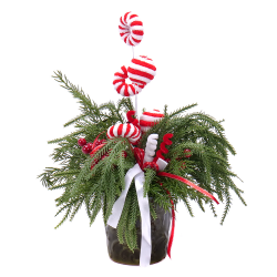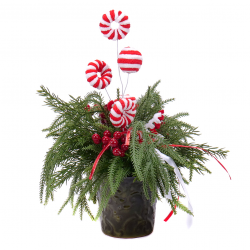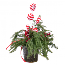 Sviatočný zimný aranžmán z umelej čačiny v keramickom obale. Je doplnený o vianočné dekorácie a ozdoby so stuhou. Ideálny doplnok, ktorý vytvorí čarovnú vianočnú náladu počas celých sviatkov.