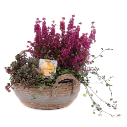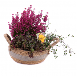 Darčekový set vo forme setu v ratanovom obale: vres - 1 ks, sedum - 1 ks a muehlenbeckia - 1 ks.