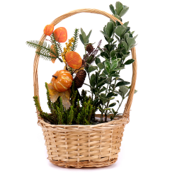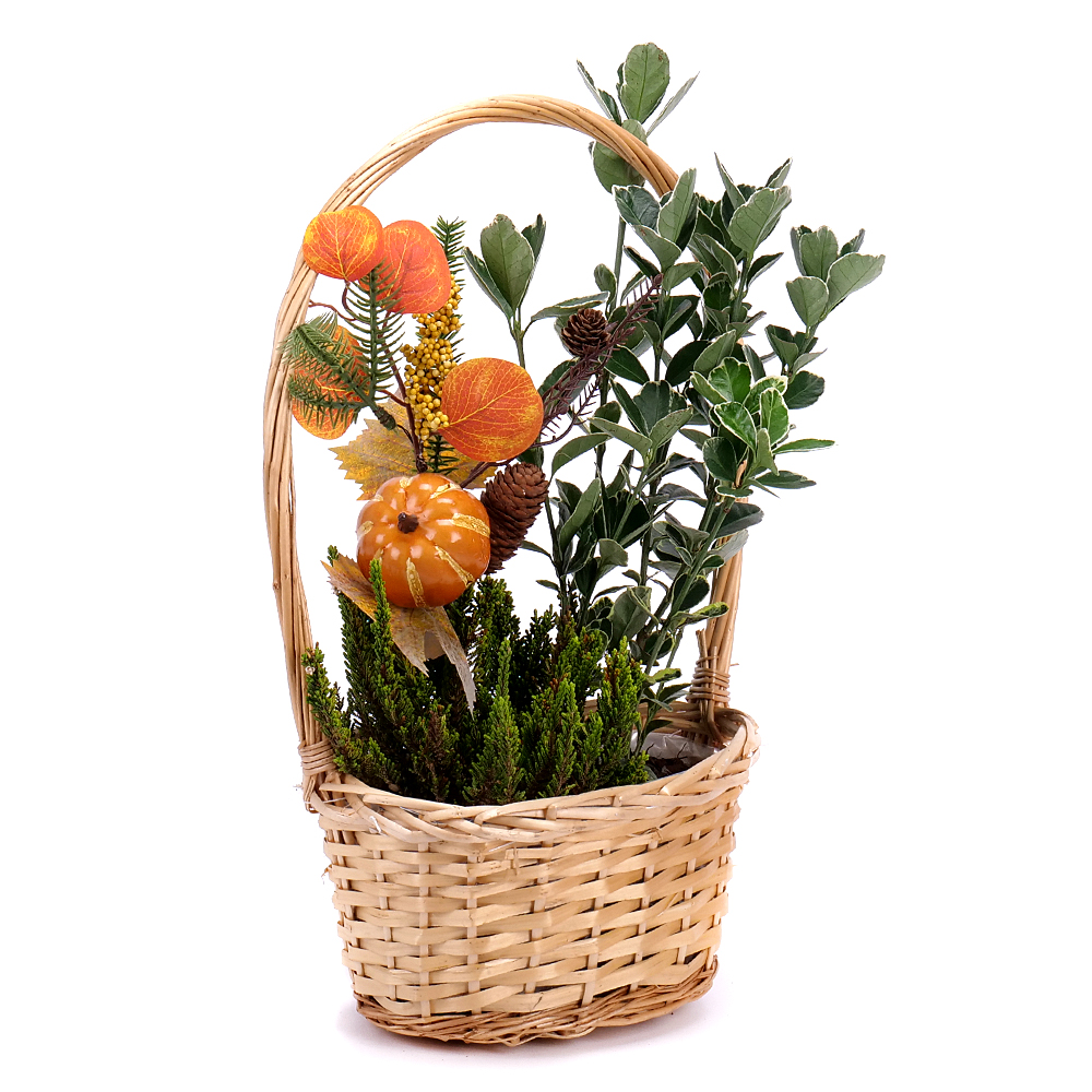 Prútený kôš s črepníkovým hebe - 1 ks, vresom - 1 ks a dekoračnou umelou vetvou s tekvičkou - 1 ks. ... Viac