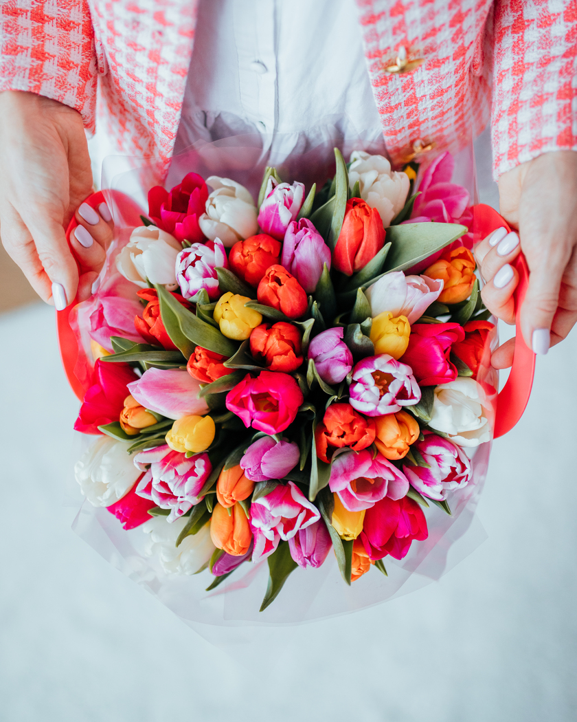 Farebné tulipány v štýlovej plastovej kvetinovej taške s dekoračným papierom a saténovou stuhou. Pre krajší deň a na každú príležitosť.
