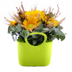 Letná kytica z 5 slnečníc, klasov a makovíc zviazaná zelenou stuhou. Slnečnice sú dodávané so štýlovou plastovou taškou zelenej farby a s výživovým doplnkom, pre dlhú životnosť kvetov.