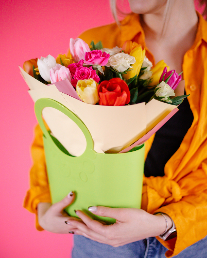 Kytica tulipánov a trsových ruží poteší každého obdarovaného. Súčasťou je nepremokavá kvetinová plastová taška, ktorú môžete použiť ako nádobu na vodu.