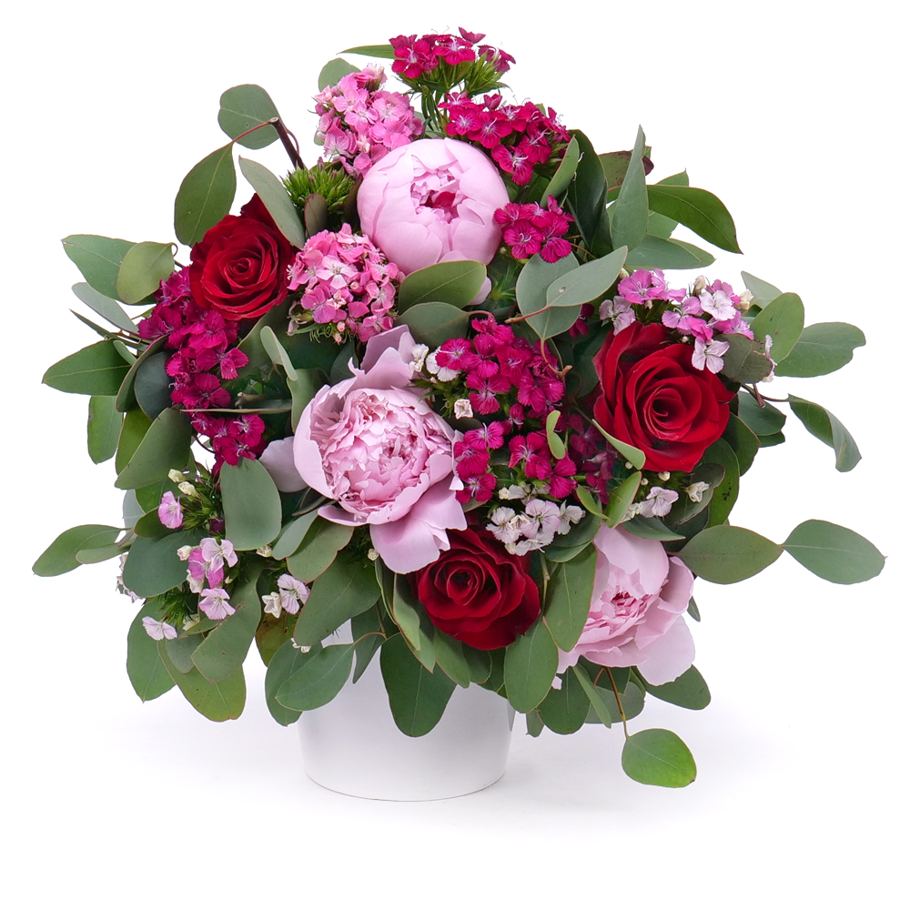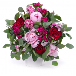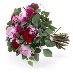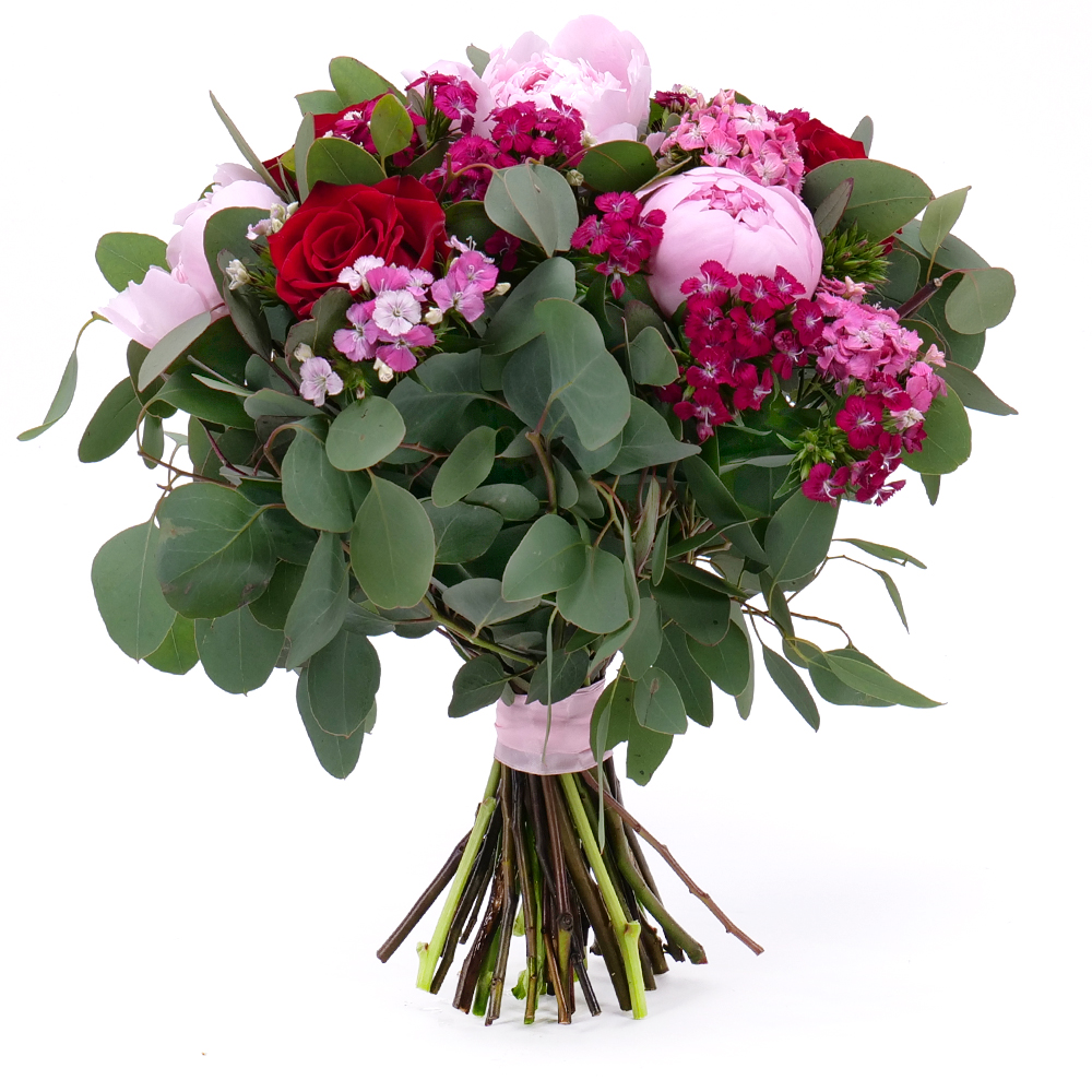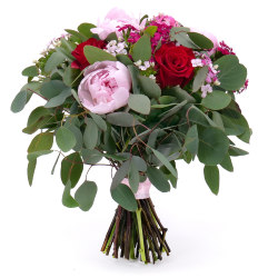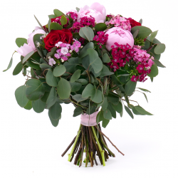 Kytica z pivónií, tureckých klinčekov a eukalyptu. Jemná, elegantná k sviatku alebo len tak pre potešenie.