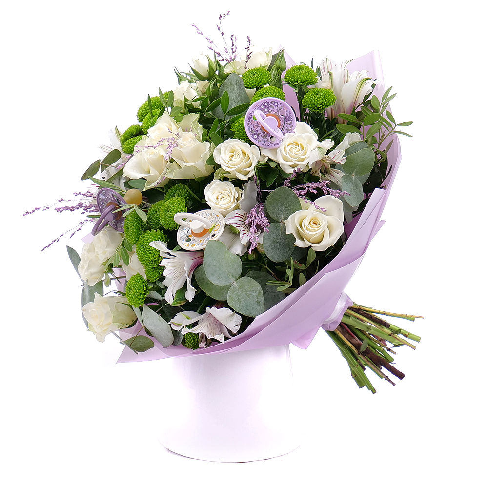 Štýlová kytica z miešaných kvetov doplnená cumlíkmi BIBS - 3 ks, s dekoračnou zeleňou a ozdobným papierom. Kytica je vhodná na darovanie k sviatku pre všetky malé oslávenkyne. ... Viac