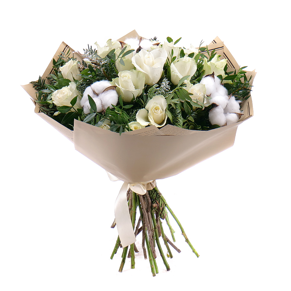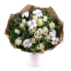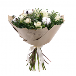 Vianočná kytica z ruží ladená do bielej farby s prírodnými doplnkami. Spríjemní Váš domov a prinesie vianočnú atmosféru na štedrovečerný stôl.