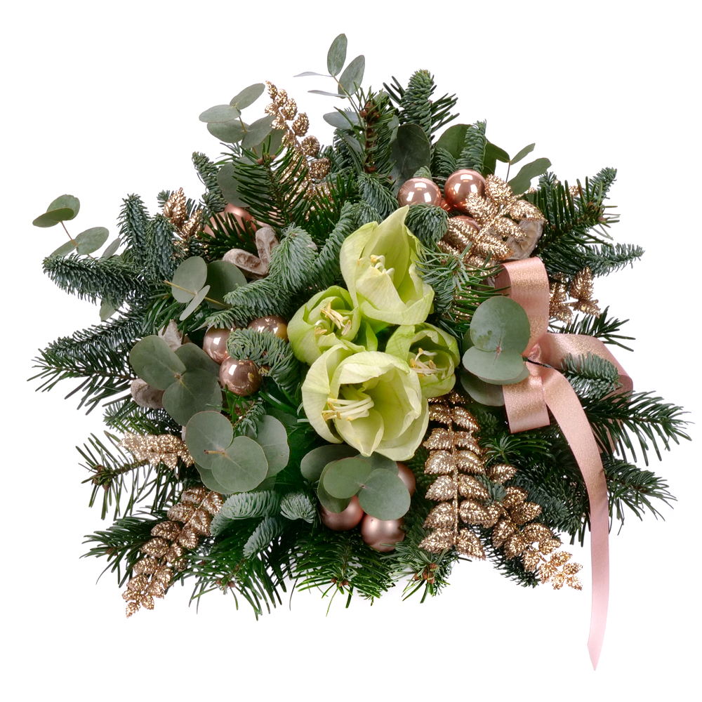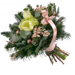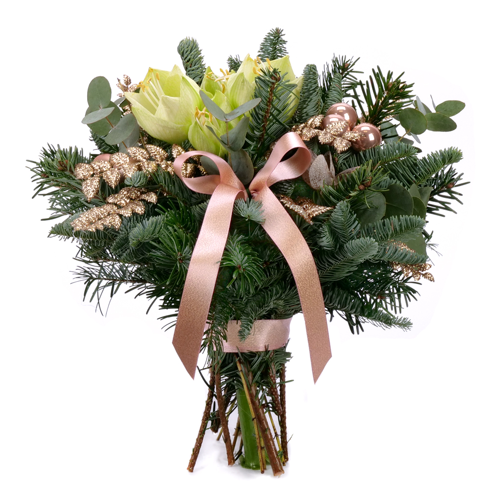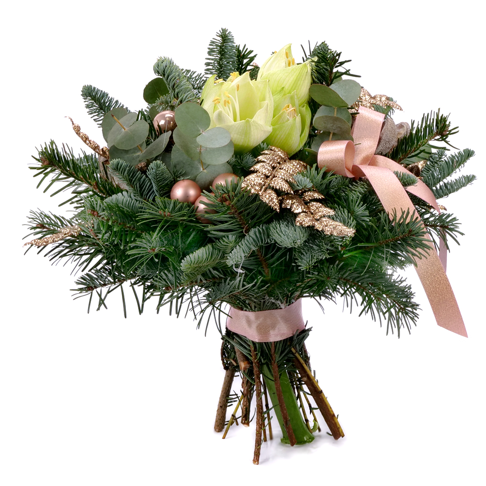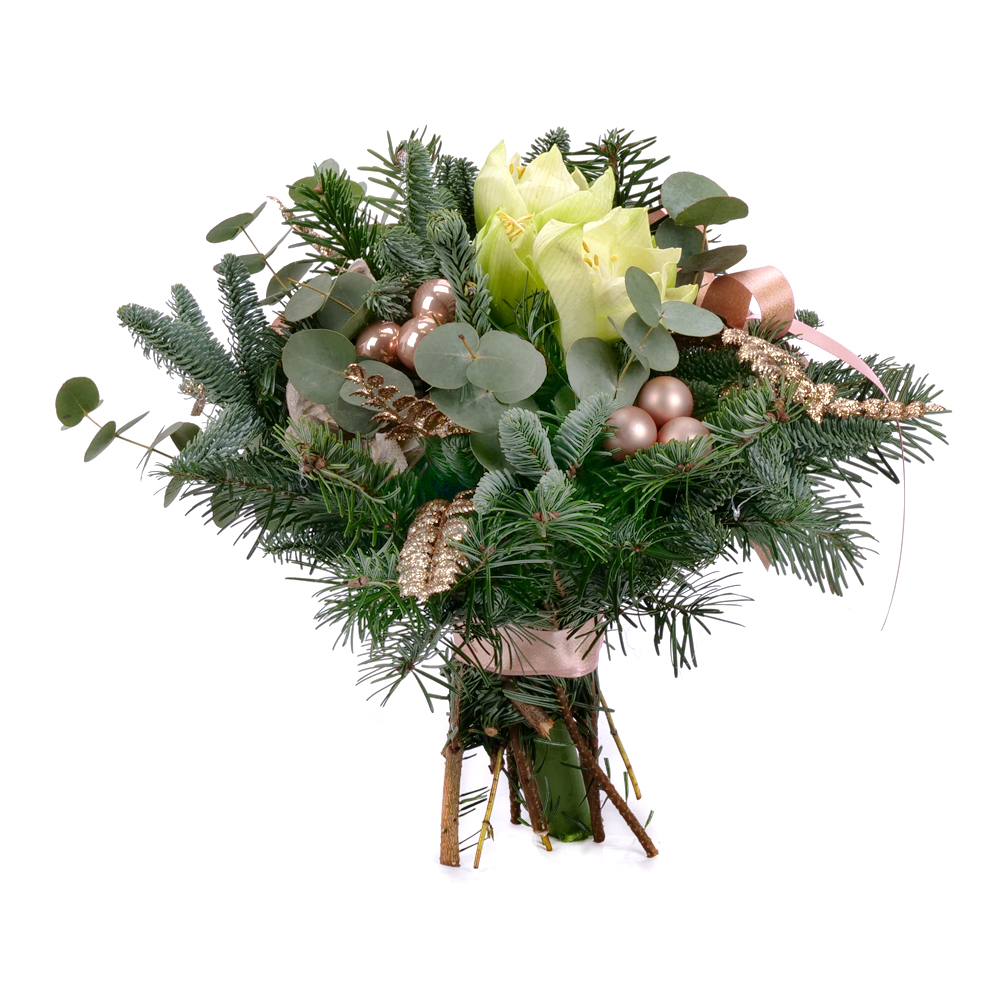 Zimná vianočná kytica s bielym amarylisom, živou čačinou, dekoračnou zeleňou, vianočnými guľami a prírodnými materiálmi. Kytica je doplnená dekoračnou stuhou. Vhodný darček k vianočným sviatkom a tiež vhodná dekorácia vianočného stola.