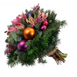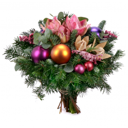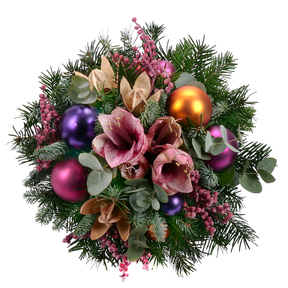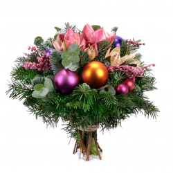 Vianočná kytica s ružovým amarylisom, živou čačinou, dekoračnou zeleňou, vianočnými guľami a prírodnými materiálmi. Vhodný darček k vianočným sviatkom a tiež vhodná dekorácia vianočného stola.