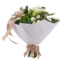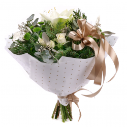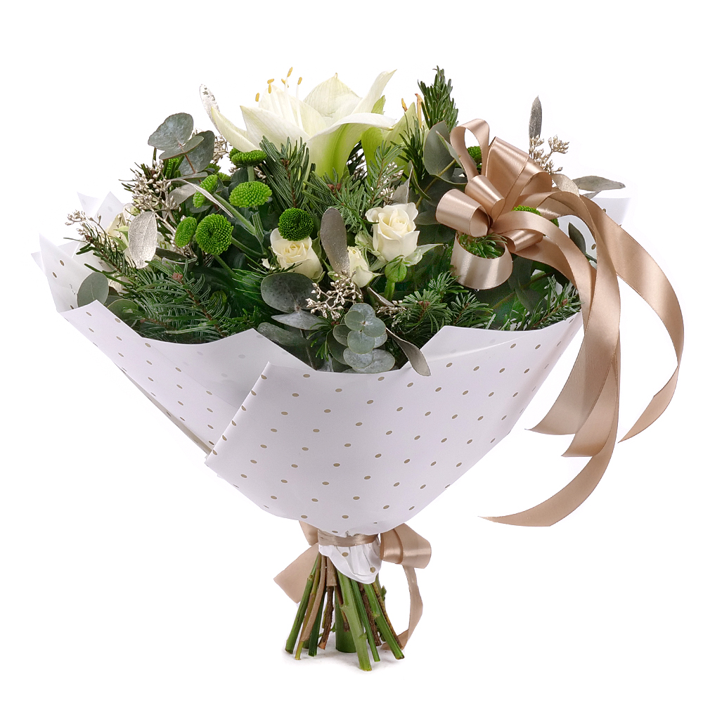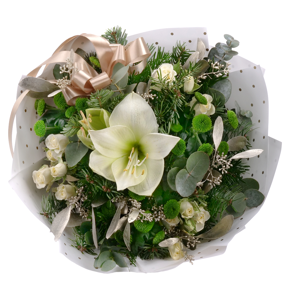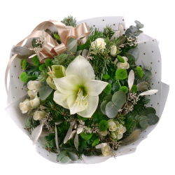 Elegantná zimná kytica k sviatku narodenín alebo menín s bielym amarylisom, bielymi trsovými ružami, zelenými santínami a doplnkovou zeleňou. Súčasťou je saténová stuha a dekoračný papier.