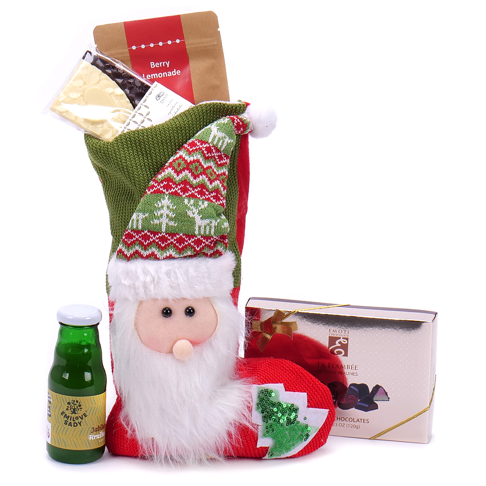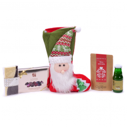 Mikulášske vrecko so zdravými pochúťkami - s ručne robenou čokoládou, 100 % džúsom jablko - hruška 0,2 l, dezertom Emoti a ovocním čajom.