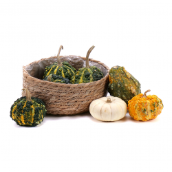 Okrasné tekvičky rôznej veľkosti a farby - 7 ks v ratanovom dekoračnom obale.