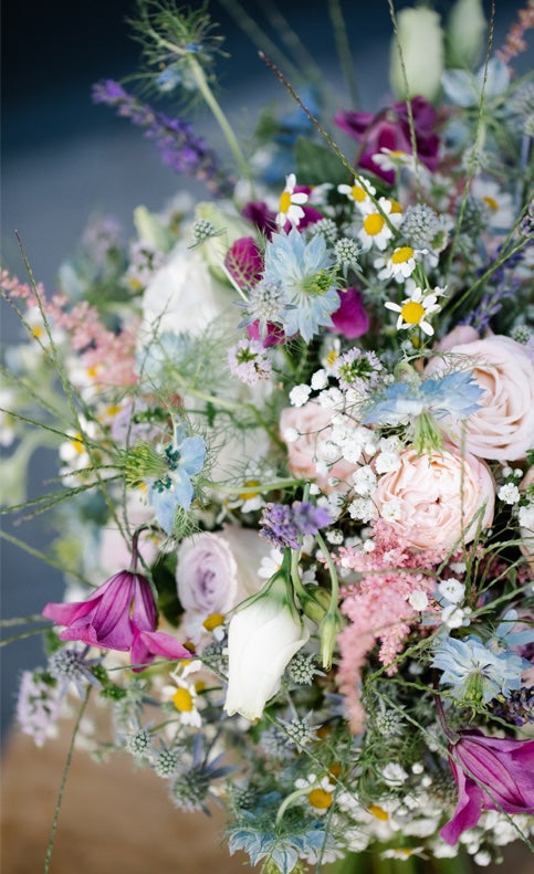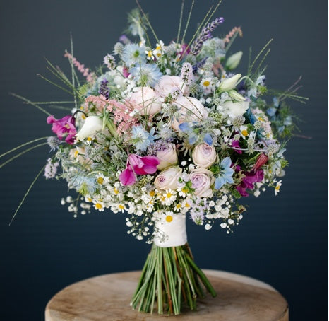 Svadobná kytica plná lúčnych kvetov, ktorá je tvorená zo základu trsových ruží v jemných odtieňoch.Celá kytica bola ladená do modro - fialových odtieňov a čo sa postarali kvety ako Clematis, Nigella, Eryngium a Mata.
