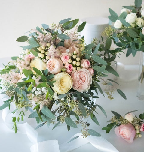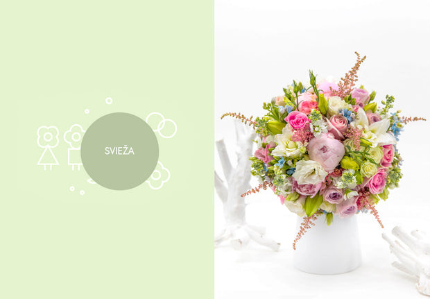Príjemná kombinácia slabučko ružových pivónií a maslových ruží vytvárajú dojem čistoty a sviežosti celej kytice. Dôraz a výraz dávajú celej kompozícii ružové trsové ruže a drobné kvety bouvardie.