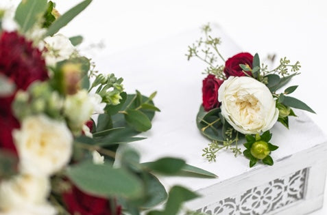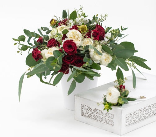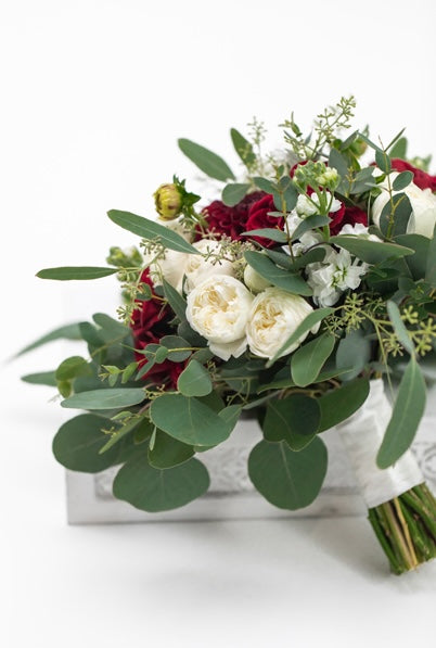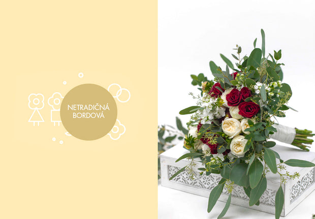 Netradiăná svadobná kytica, ktorá bola vytvorená z bielych a bordovych irsových ruzi. Táto kytica rozhodne neostane nepovsimnutou a bude dokonalo vynikat pri bielych satách nevesty. Za nás rozhodne áno! Kyticu d'alej dopiña mix eucalyptusu, matthiola a dahlia.