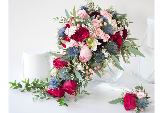 Svadobná kytica bola aranžovaná v predĺženom tvare. Dominantnými kvetmi boli ruže a modré kvety eryngia doplnené bielymi fréziami, kvetmi chamelaucia, dáliami, ružovým hypericom a zeleňou v podobe eukalyptu.