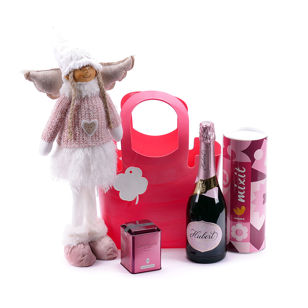 Darčekový set s postavou anjela - 1 ks, dekoračnou plastovou taškou- 1 ks, Hubertom Original Rose Brut - 1 ks a tubou jahodový mix s orieškami a čokoládou -1 ks.