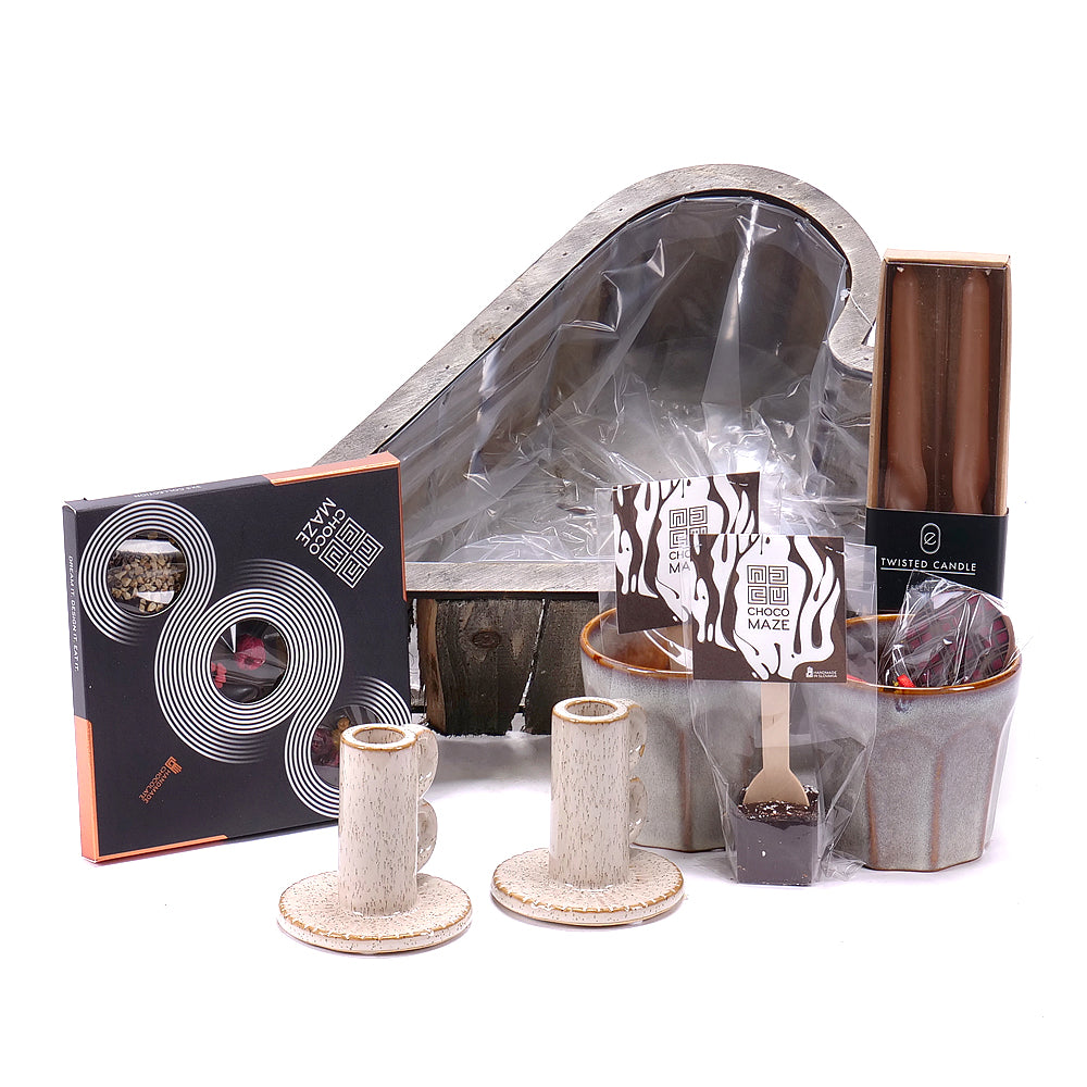 Darčekový drevený box v tvare srdca, ktorý obsahuje: ručne robenú čokoládu - 1 ks, horúcu čokoládu na paličke - 2 ks, čokoládové lízatko - 2 ks, keramický pohár - 2 ks, keramický svietnik - 2 ks, sada sviečok - 1 ks,