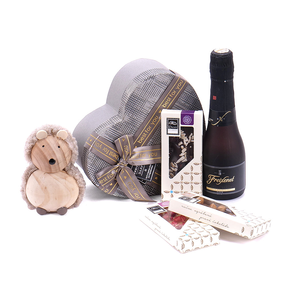 Darčekový set s čokoládou - tri druhy - mliečna, horká, biela, sektom Freixenet 0,2 l a dekoráciou dreveného ježka. Súčasťou je set v tvare srdca. Čítať viac