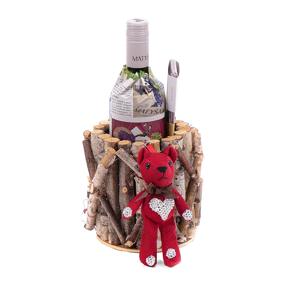 Darčekový drevený box s hroznovou šťavou Matyšák, ručne robenou čokoládou mini mliečna a plyšovou kľúčenkou v tvare macka červenej farby. Čítať viac
