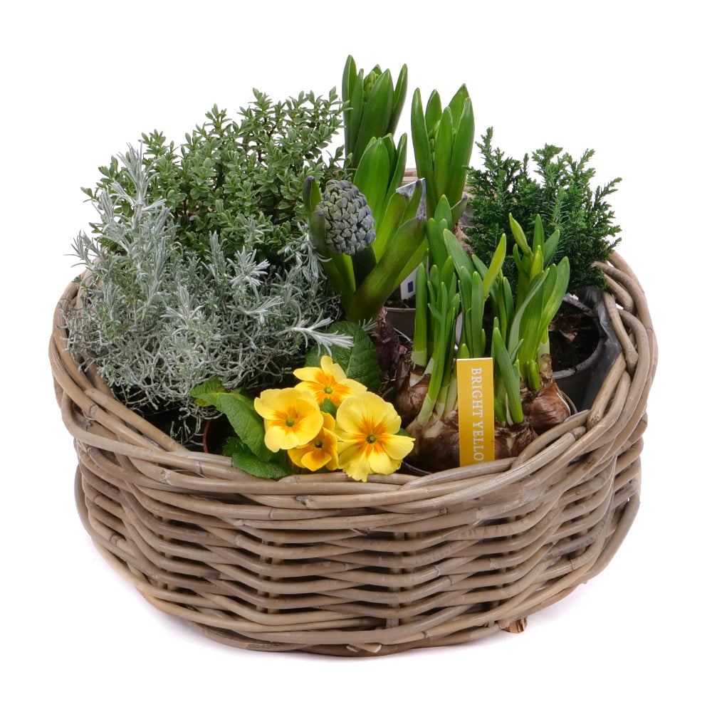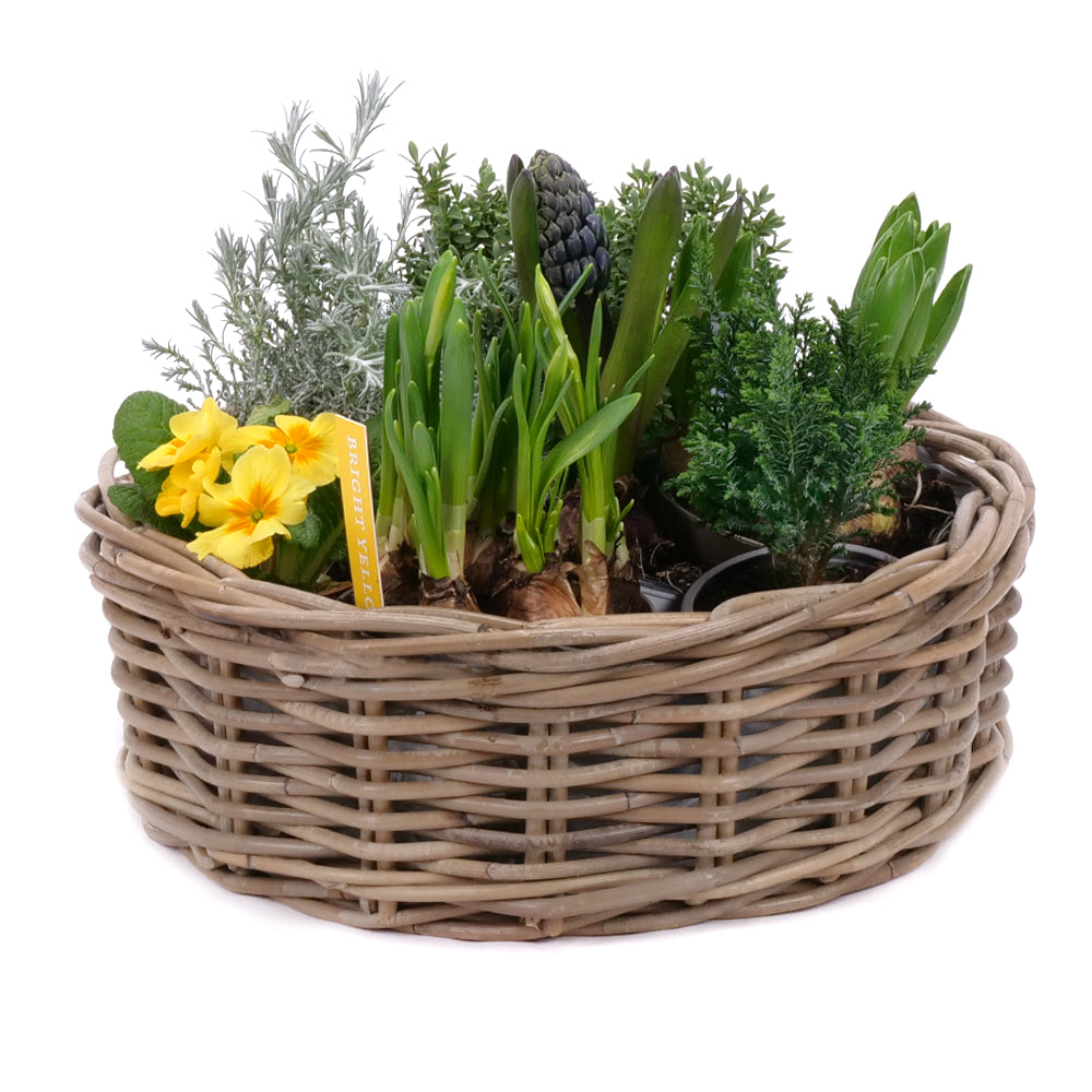 Mix rôznych druhov jarných kvetov - narcisy, hyacinty, primulky, leucophyta, hebe, chamaecyparis. Súčasťou je prútený kôš, ktorý je odolný voči poveternostným podmienkam. Čítať viac