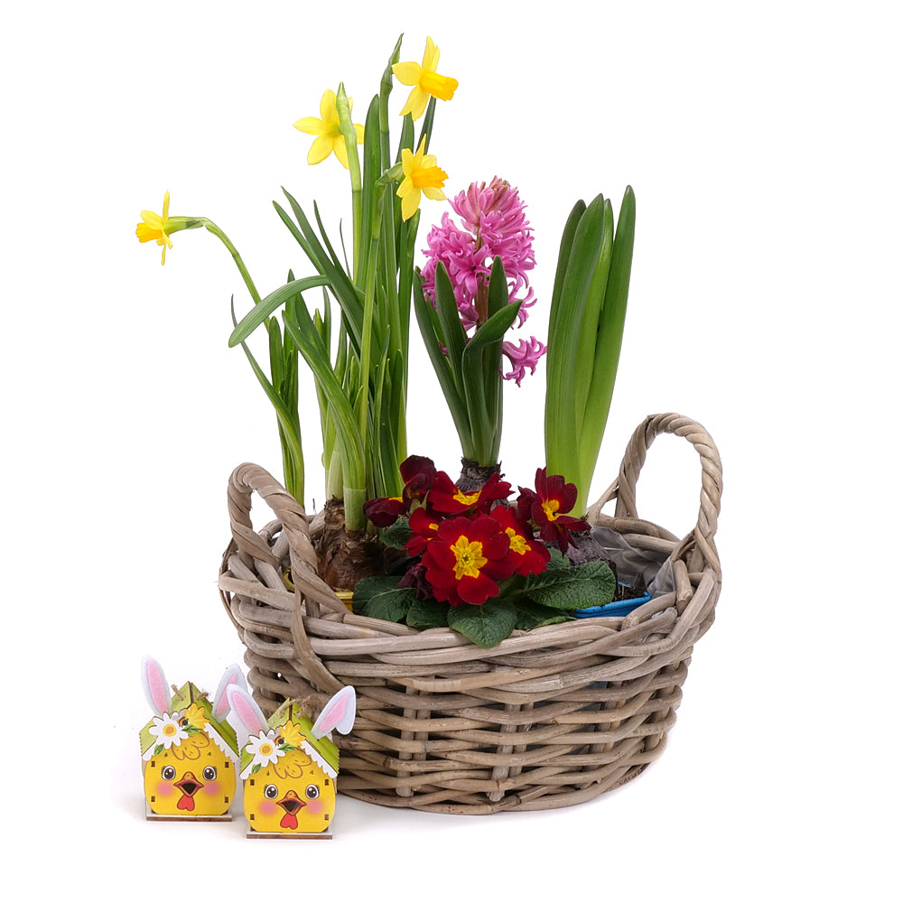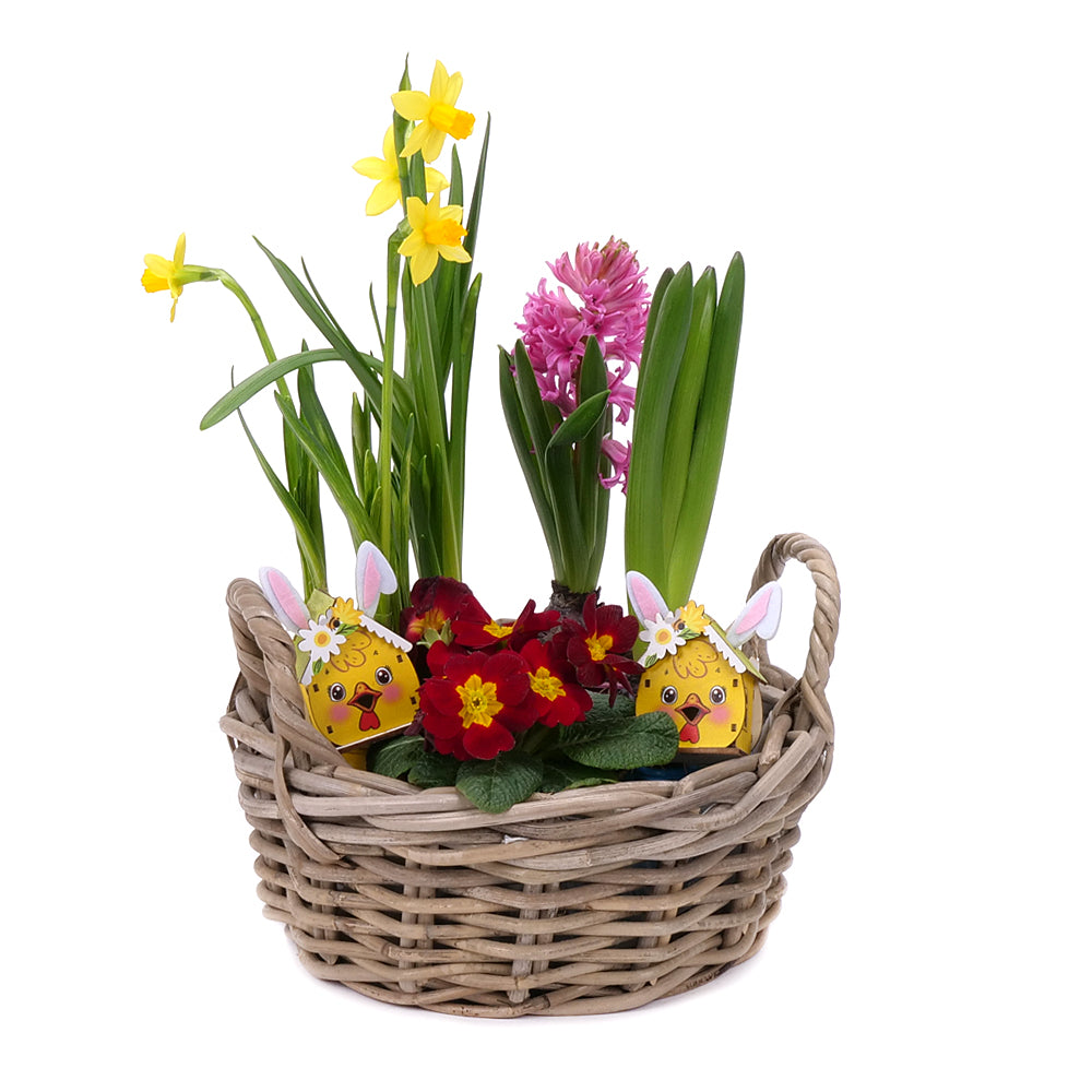 Mix jarných kvetov - hyacint, narcis, primulka v dekoračnom košíku. Súčasťou je mini drevená dekorácia - 2 ks. Črepníkové kvety sú starostlivo zabalené a s láskou zasielané v darčekových prepravných krabiciach spoločnosti Kvety.sk.