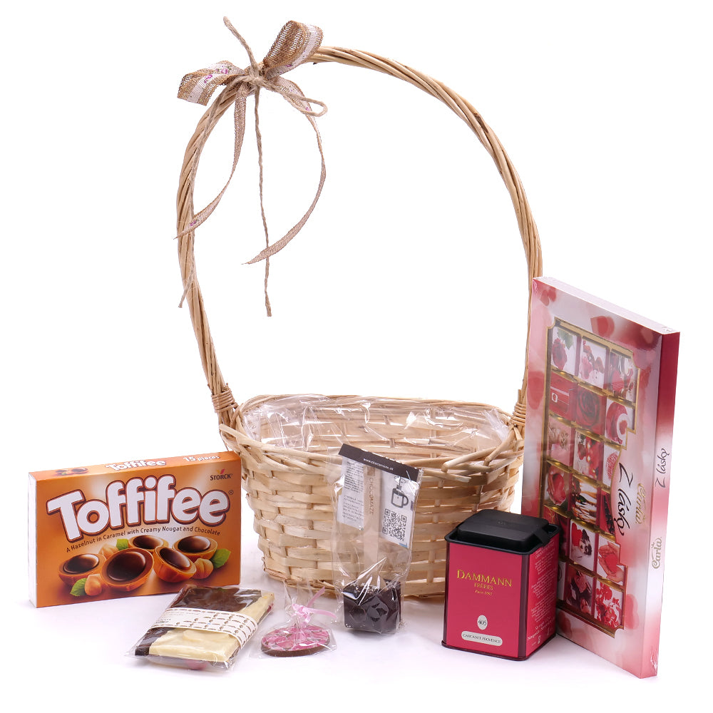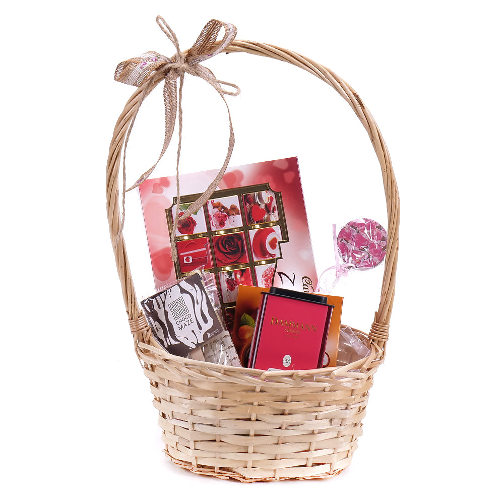 Darčekový prútený košík s cukrovinkami, čajom Dammann a dezertom Carla z lásky.
