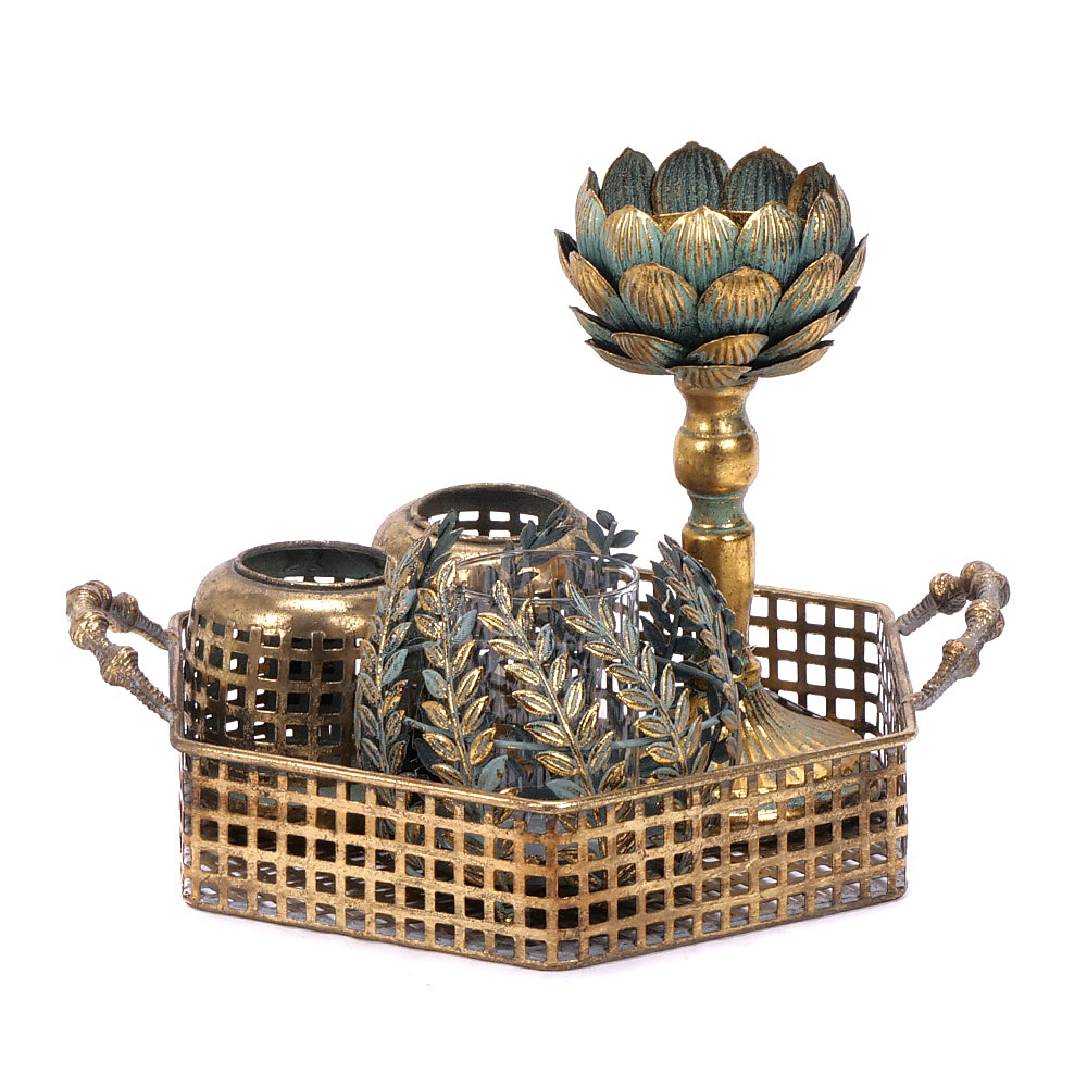Elegantný darček v podobe kovových doplnkov do bytu alebo domu. Skladá sa z: kovového podnosu - 1 ks, kovových svietnikov - 2 ks, svietniku v tvare kvetu - 1 ks a svietniku so skleným krytom - 1 ks.
