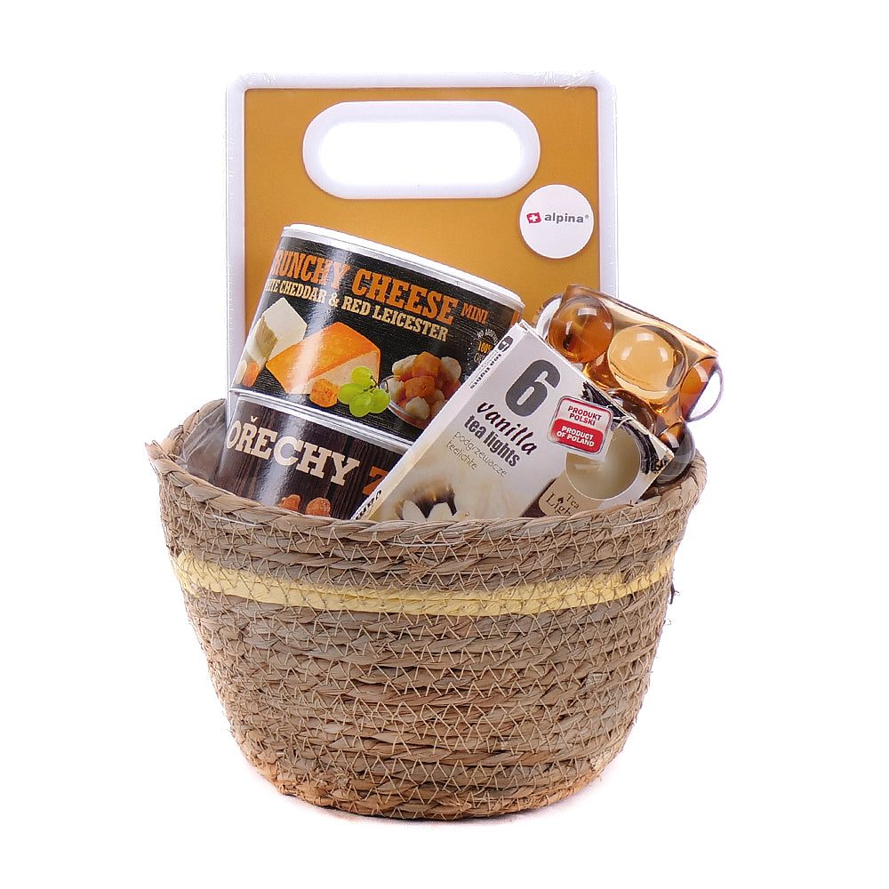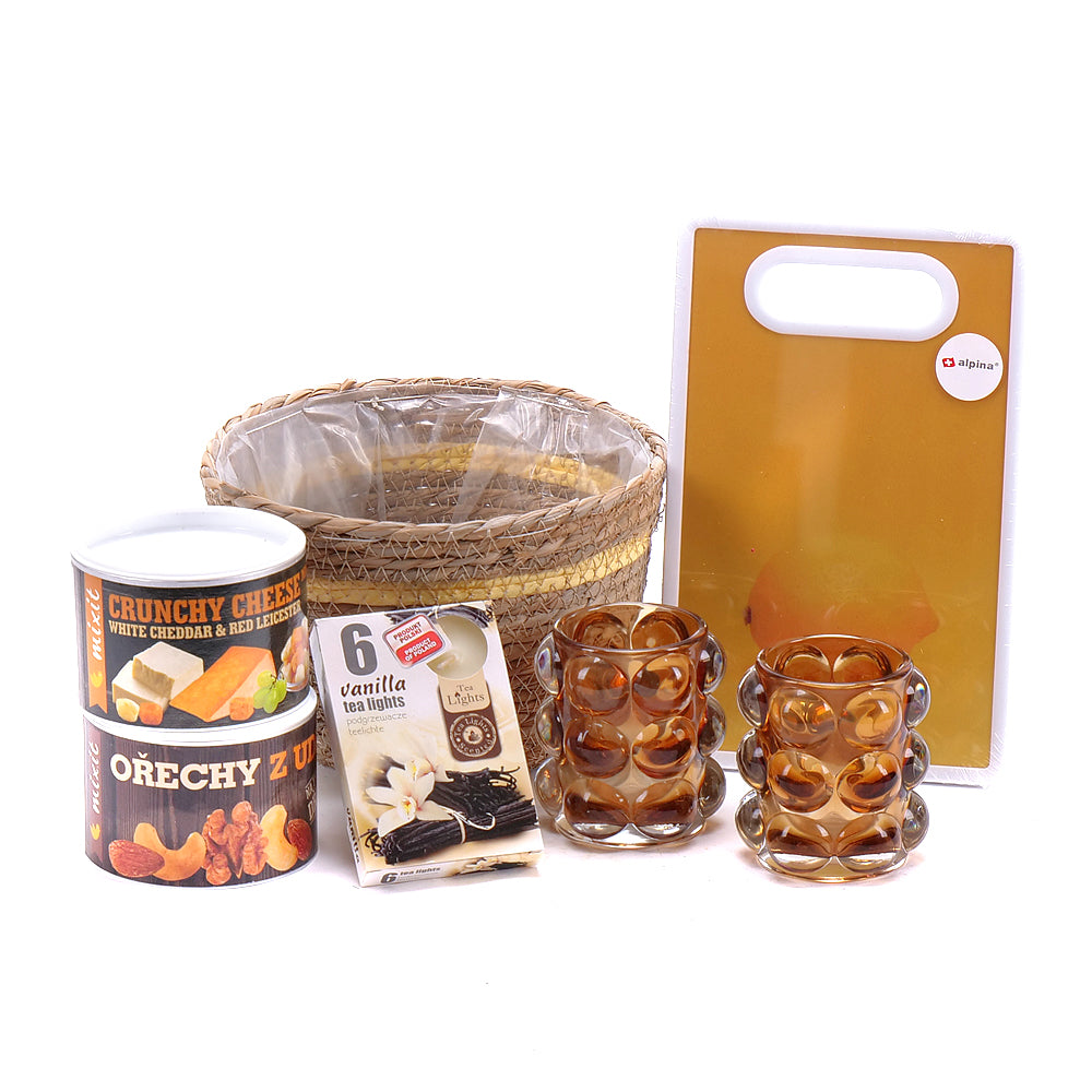 Darčekový ratanový kôš so sadou čajových sviečok - 6 ks, sklenenými svietnikmi - 2 ks, doskou na krájanie - 1 ks, syrom Cheddar - 1 ks a zmesou orechov - 1 ks.