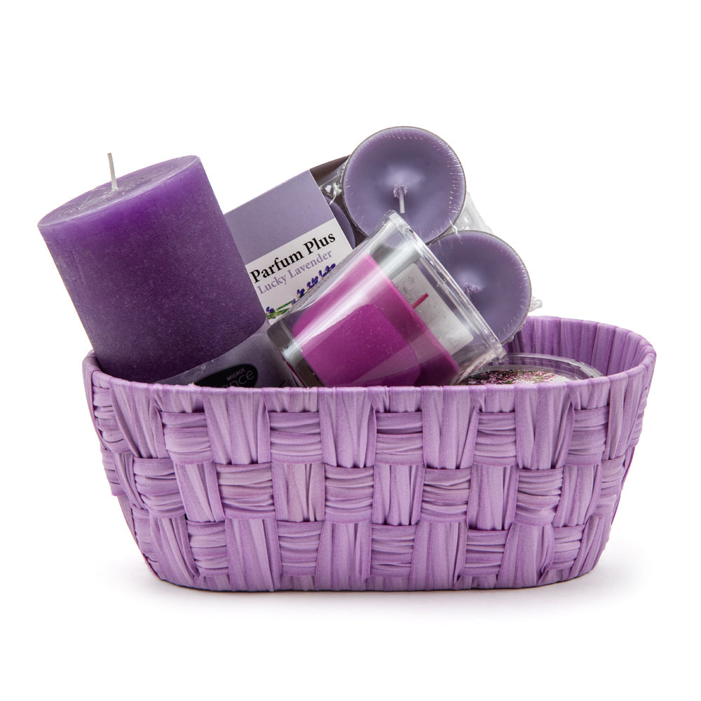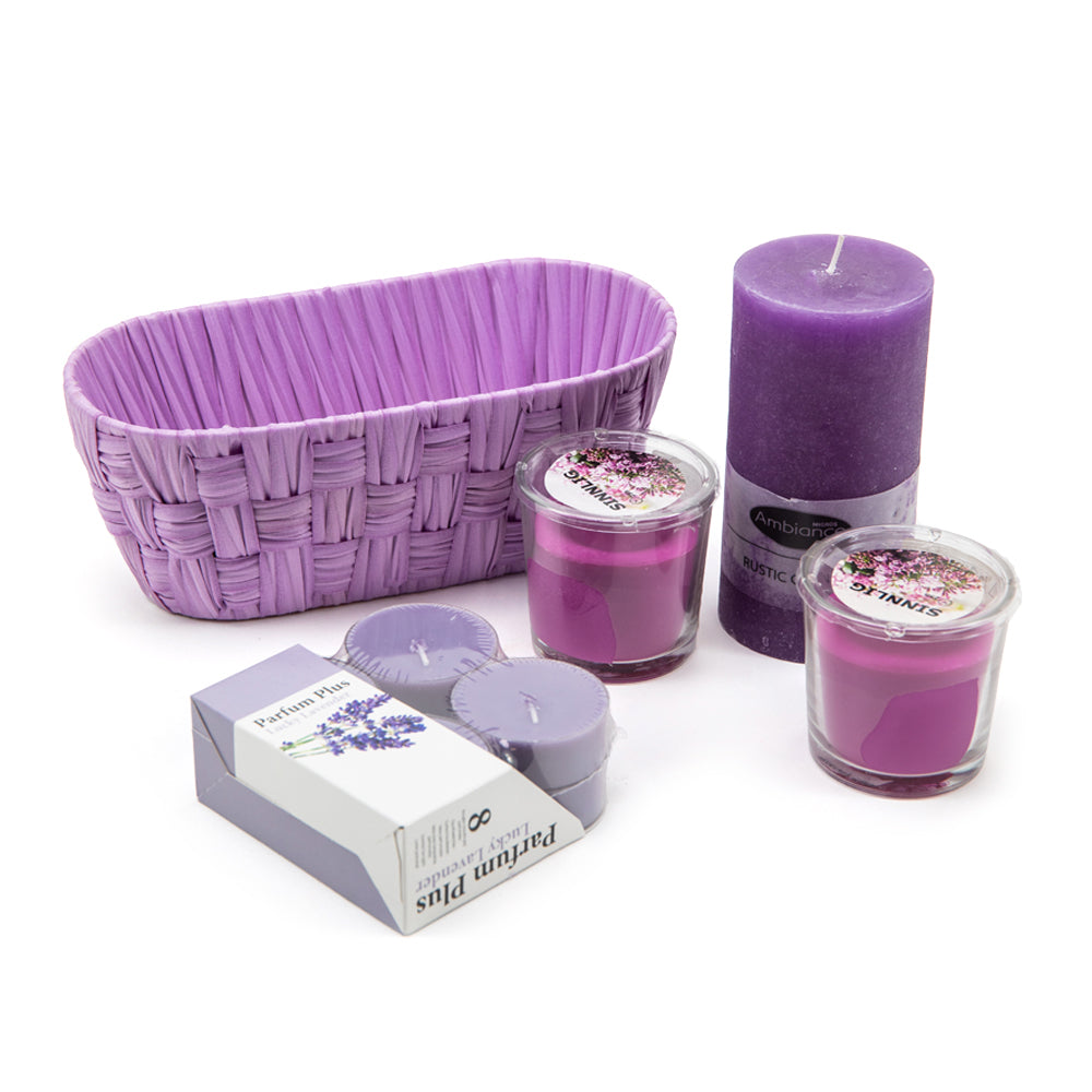 Fialový prútený kôš s dekoračnými sviečkami rôznych druhov.SloženíSviečka valec fialová 75/150 610g - 1 ks Čítať viac