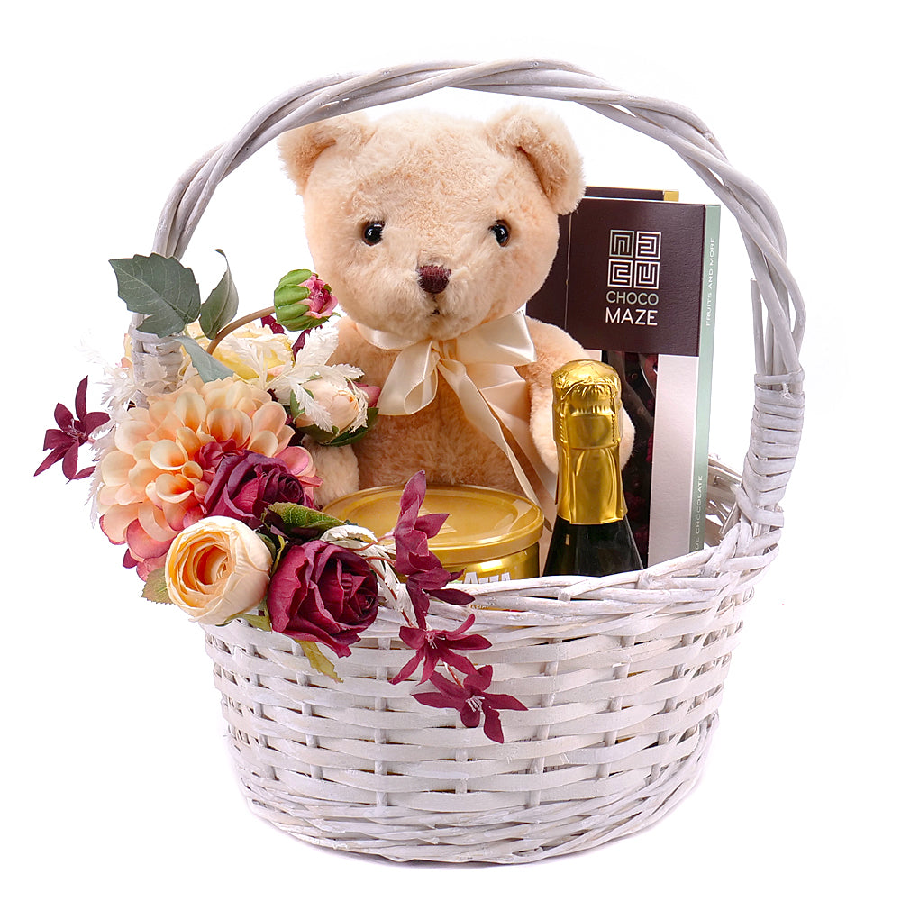 Darčekový prútený biely košík dozdobený umelými kvetmi s ručne robenou čokoládou - horká a mliečna, kávou Lavazza ORO - 1 ks, Proseccom mini - 1 ks a plyšovým mackom - 1 ks. Je vhodným darčekom pre Vašich blízkych a priateľov.