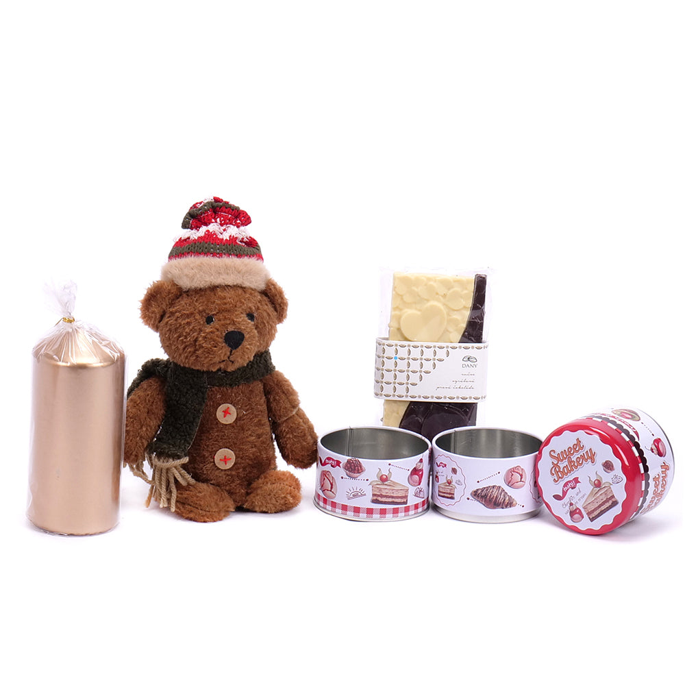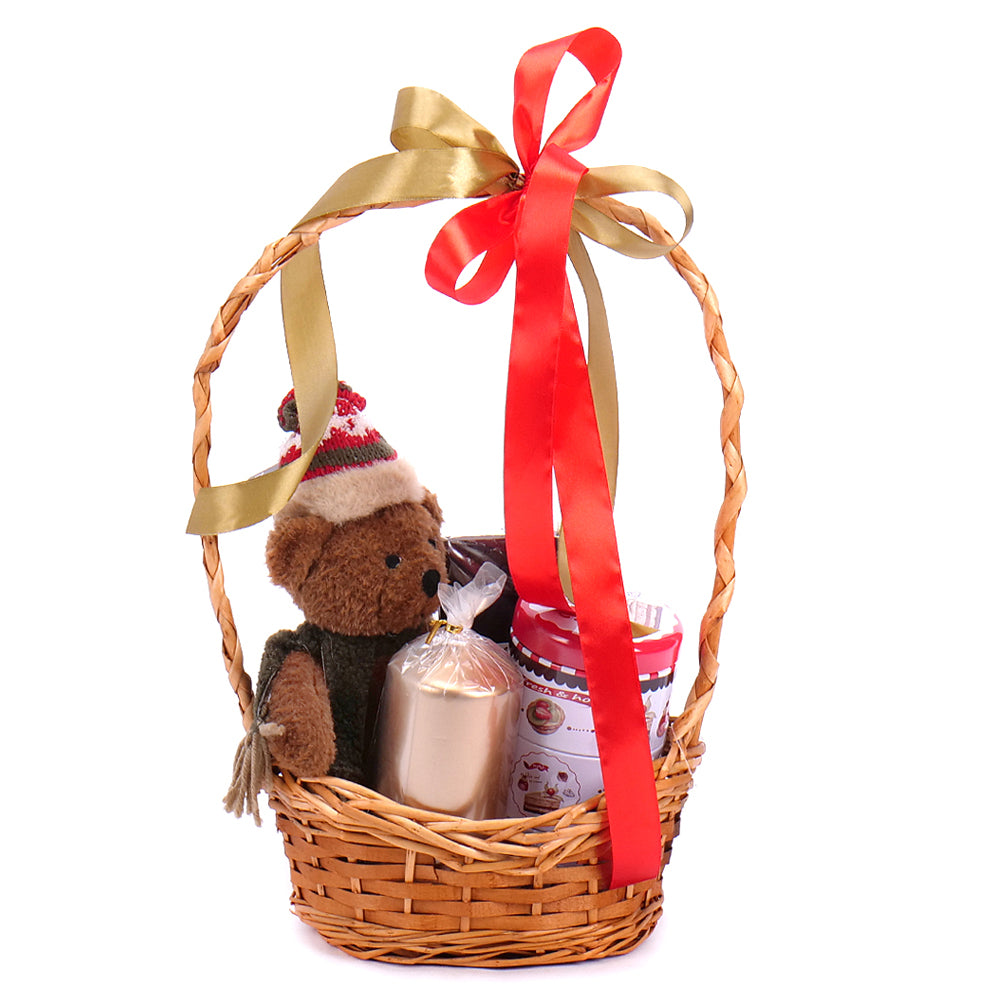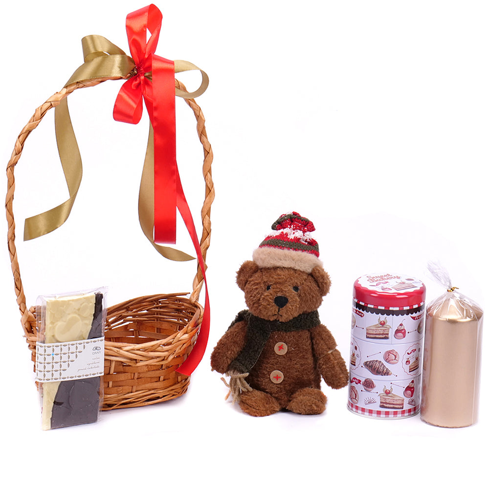 Vianočný set v prútenom košíku so saténovou stuhou, plyšovým vianočným medvedíkom, dekoračnou sviečkou, plechovou dózou a ručne robenou tabuľkovou čokoládou so sušeným ovocím.