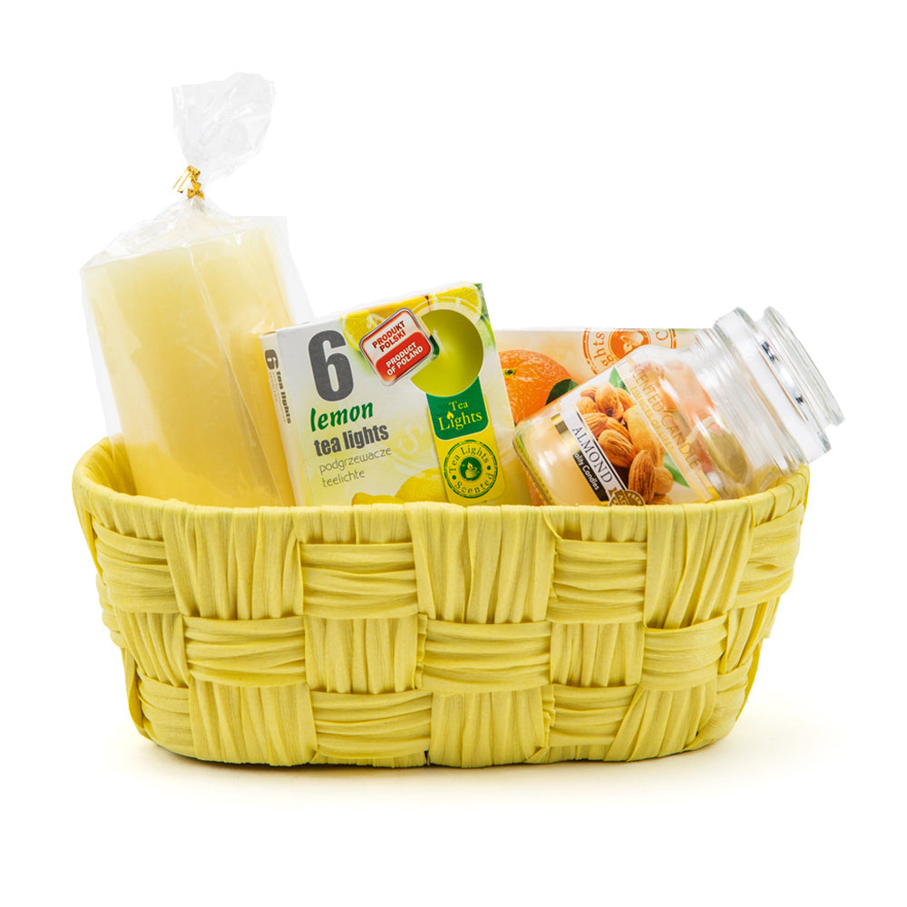 Žltý umelý pletený kôš s dekoračnými sviečkami. Čítať viac