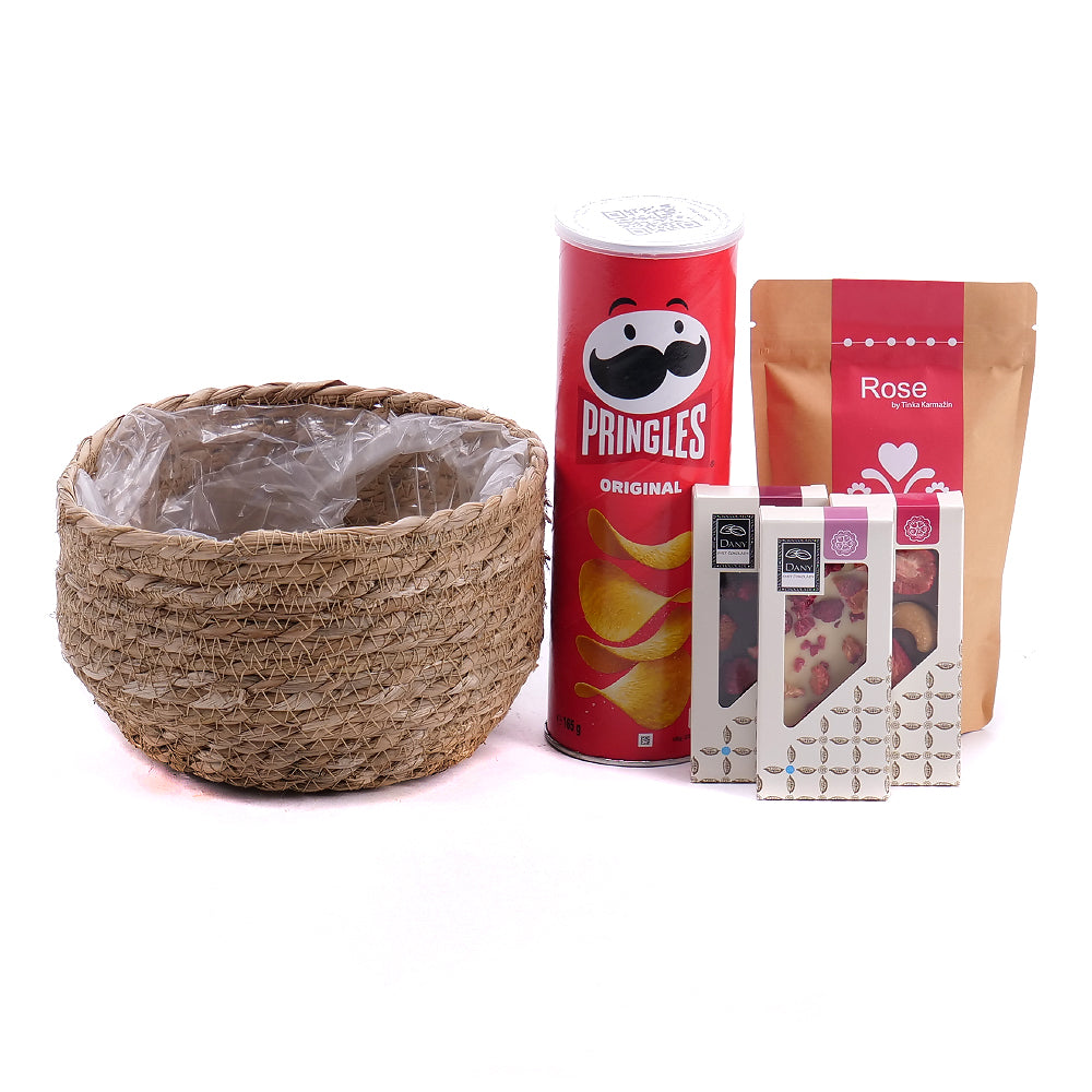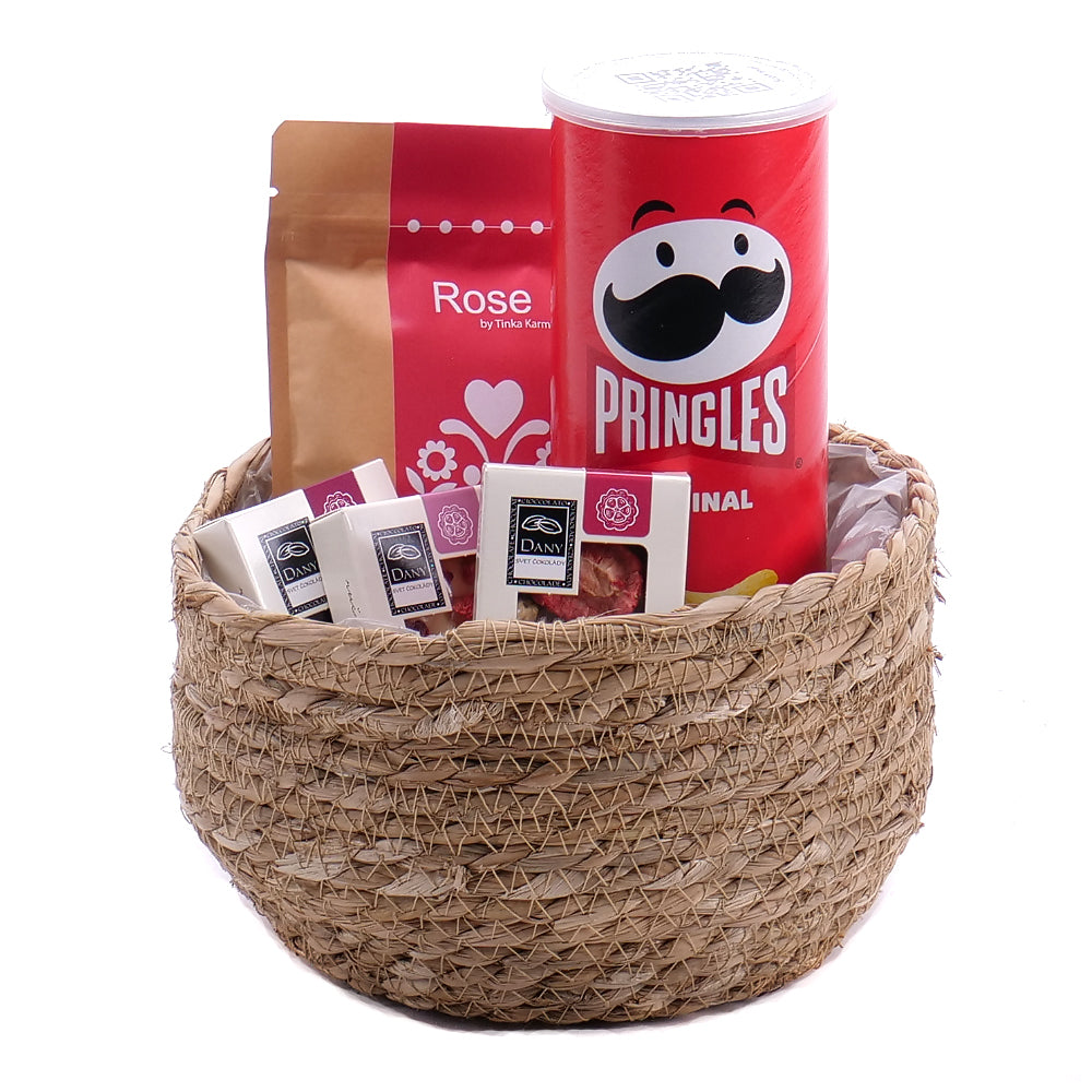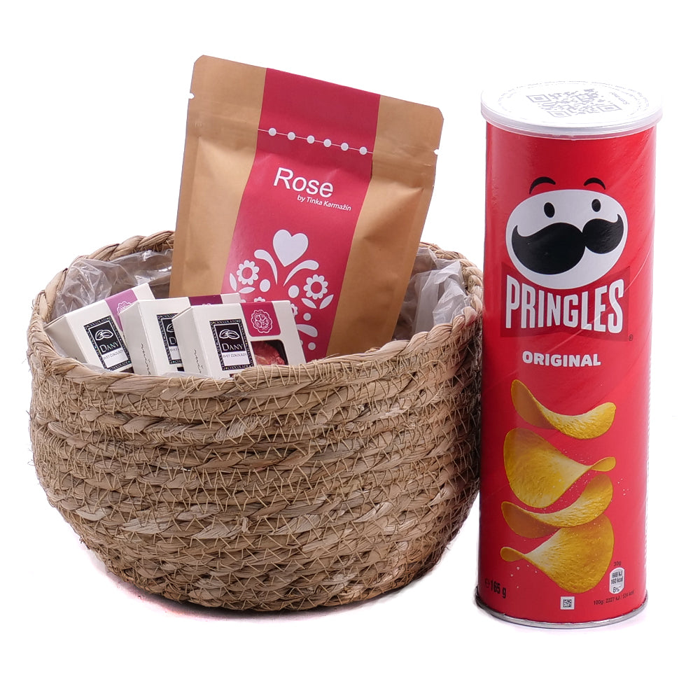 Darčekový ratanový hnedý box s bylinkovým čajom Wilfred Rose, chipsami Pringles, a ručne robenými čokoládami - horká, mliečna, biela.SloženíChipsy Pringles... Čítať viac