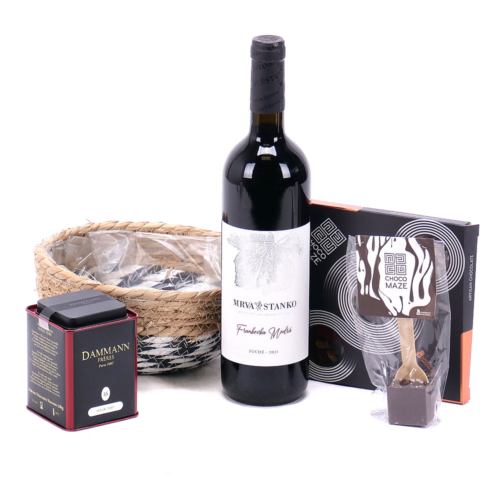 Urobte radosť darovaním setu s kvalitným vínom Mrva & Stanko, ručne robenou čokoládou so sušeným ovocím, čajom Dammann a horúcou čokoládou na paličke.