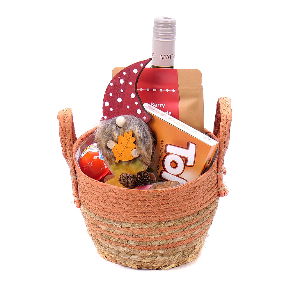 Set obsahuje: ratanový kôš - 1 ks, hroznovú šťavu Matyšák - 1 ks, dezert Toffifee - 1 ks, ručne robený ovocný čaj - 1 ks, kinder joy vajíčka - 2 ks a drevenú dekoráciu - 1 ks.