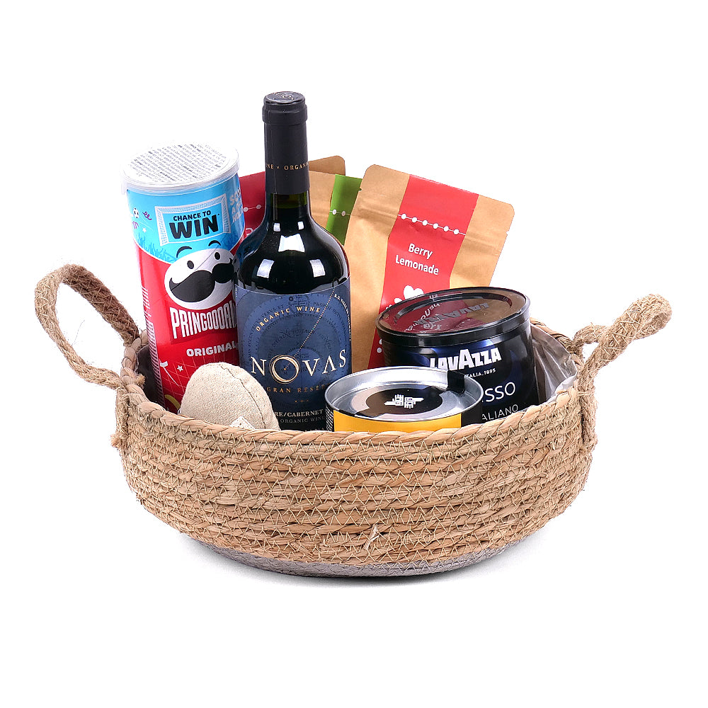Darčekový set zložený z kvalitného vína Emiliana Novas, slaných chipsov Pringles, ručne robených mandlí v čokoláde, kávy Lavazza Club a ručne robeného čaju - zelený, ovocný, bylinkový.