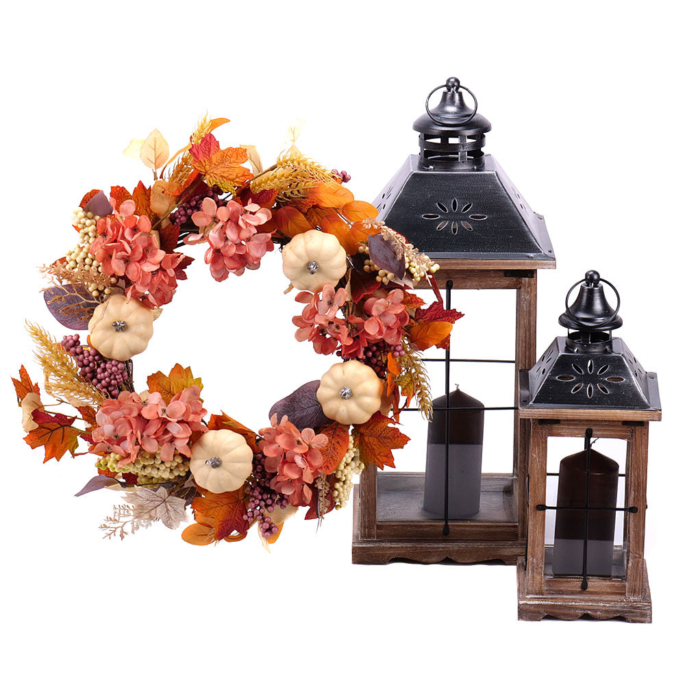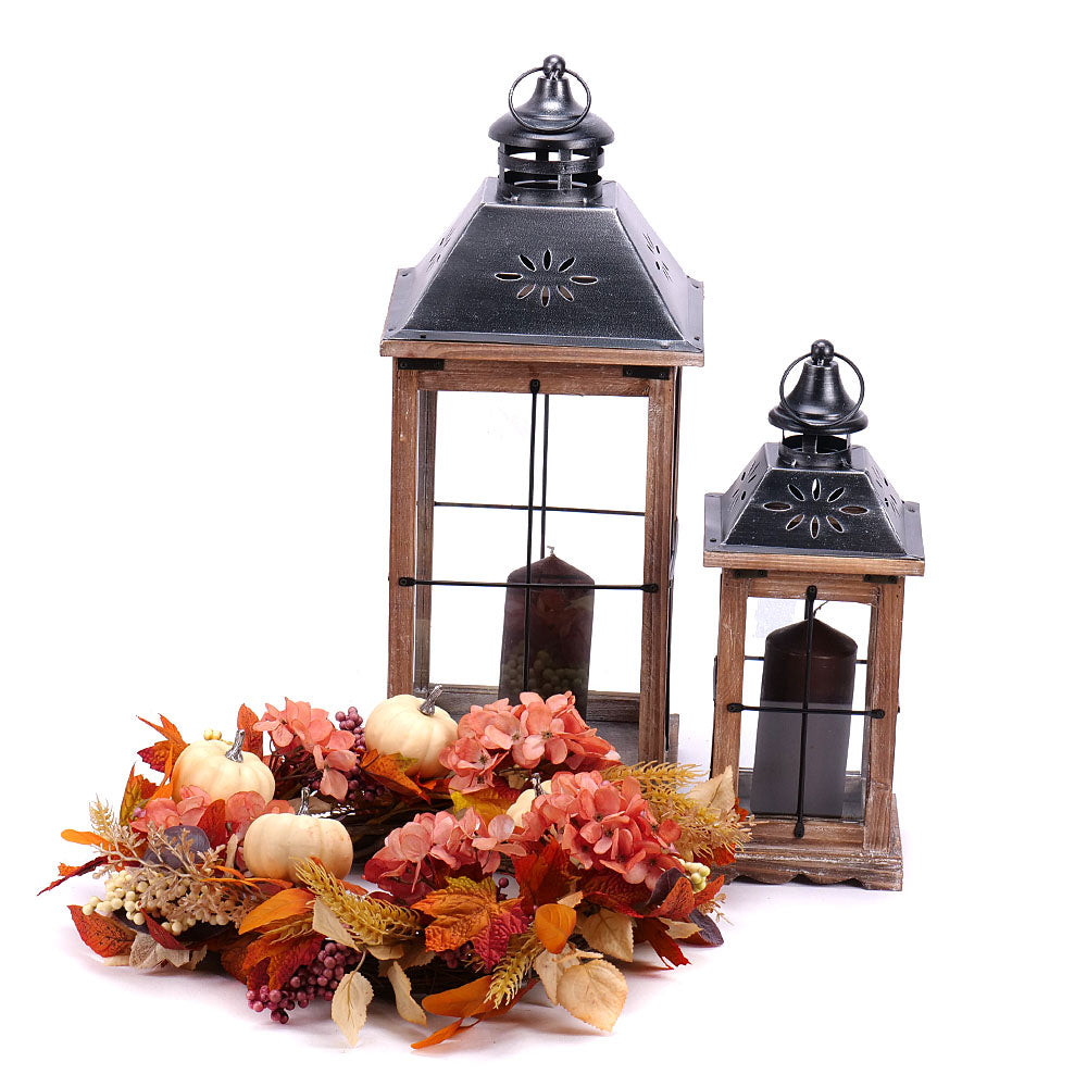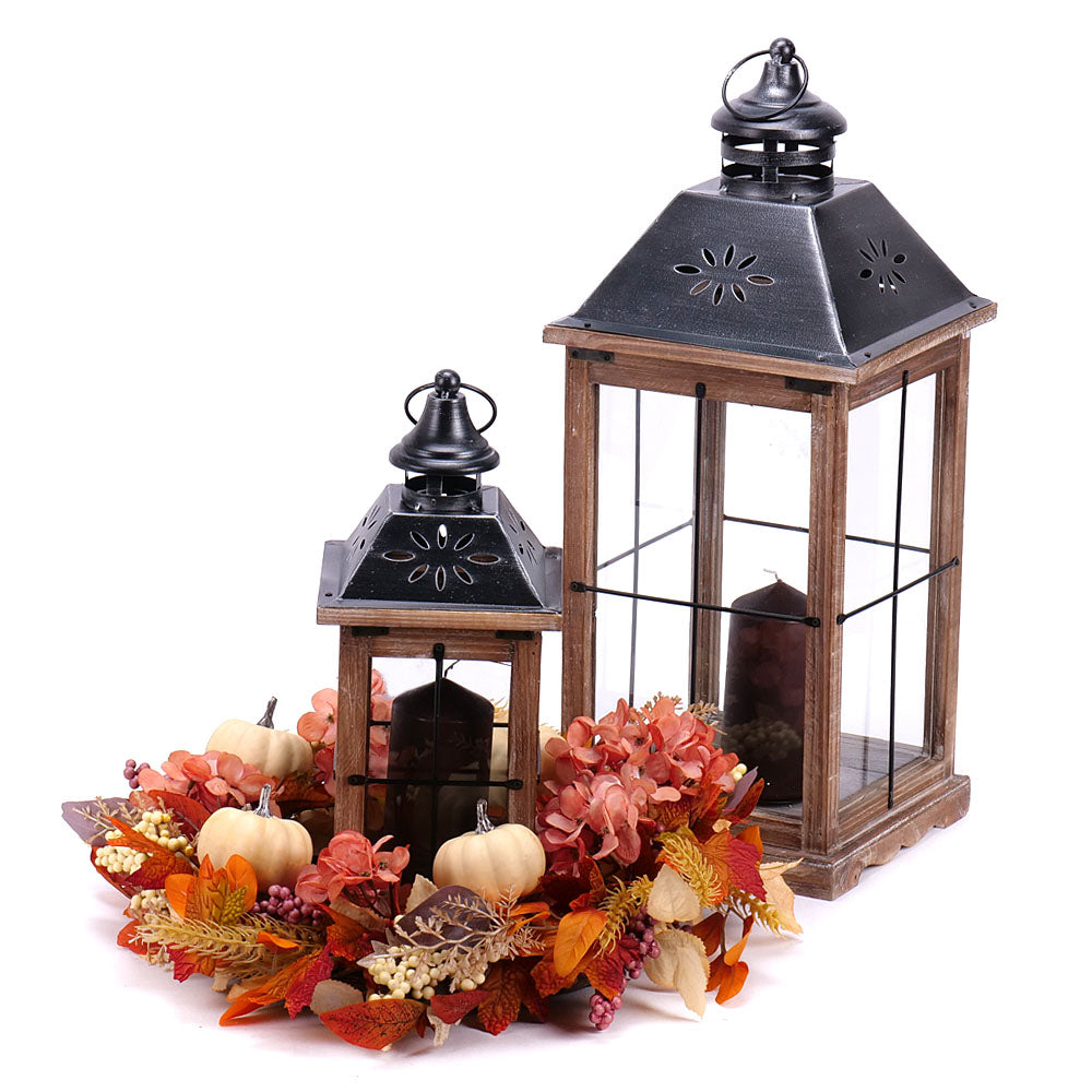 Drevené lampáše (2 ks) rôznych veľkostí so sviečkami a prúteným vencom dozdobeným umelými kvetmi a tekvicami.