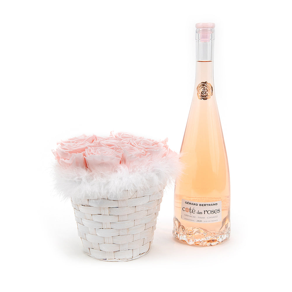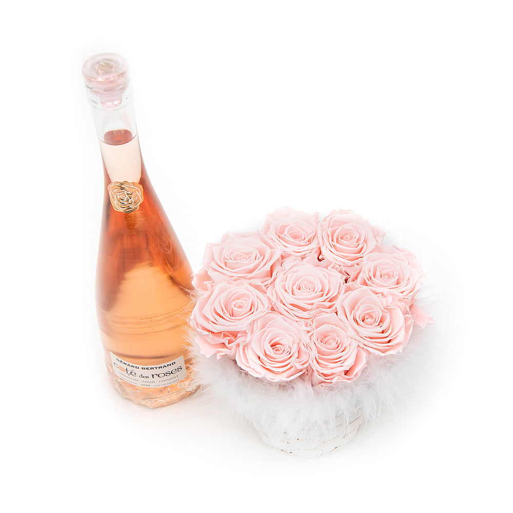 Potešte srdce milovanej osoby a darujte jej romantický drevený box z luxusných In Eterno ruží doplnený jemným bielym perím. Súčasťou setu je aj víno Gérard bertrand Coté des Roses Rosé.