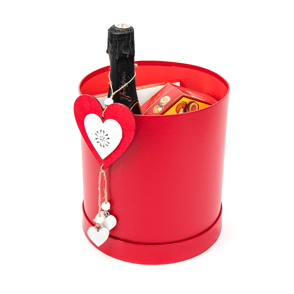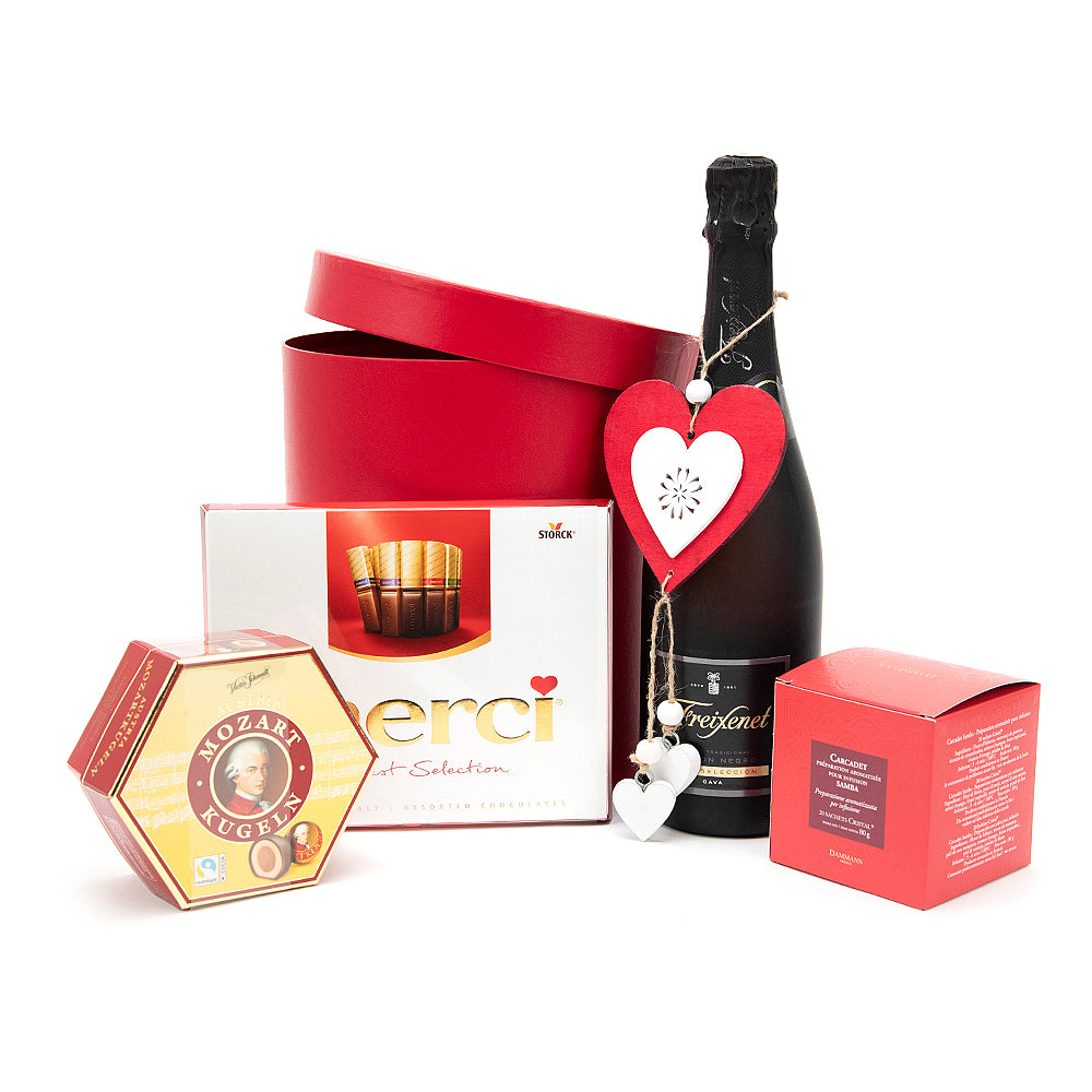 Červený darčekový box s dezertom Merci, Mozart kugeln, čajom Dammann Samba a šumivým lahodným vínom Freixenet. Súčasťou setu je aj drevené dekoračné srdiečko.
