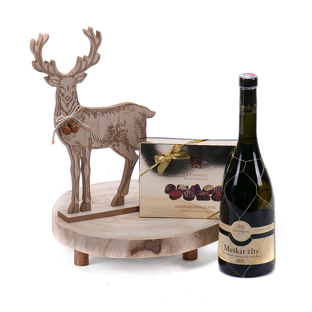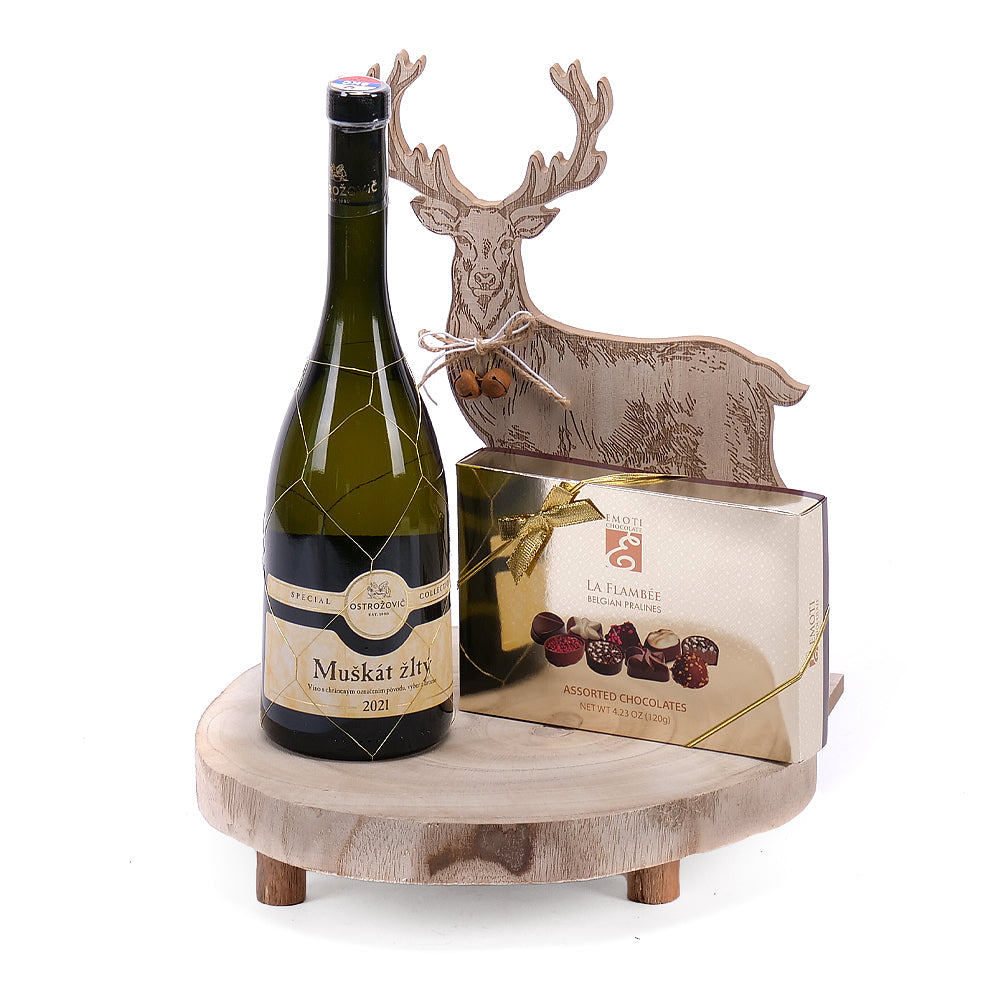 Originálny darček na drevenom podklade s vínom J & J Ostrožovič muškát žltý - 1 ks, pralinkami Emoti la flambe... Čítať viac