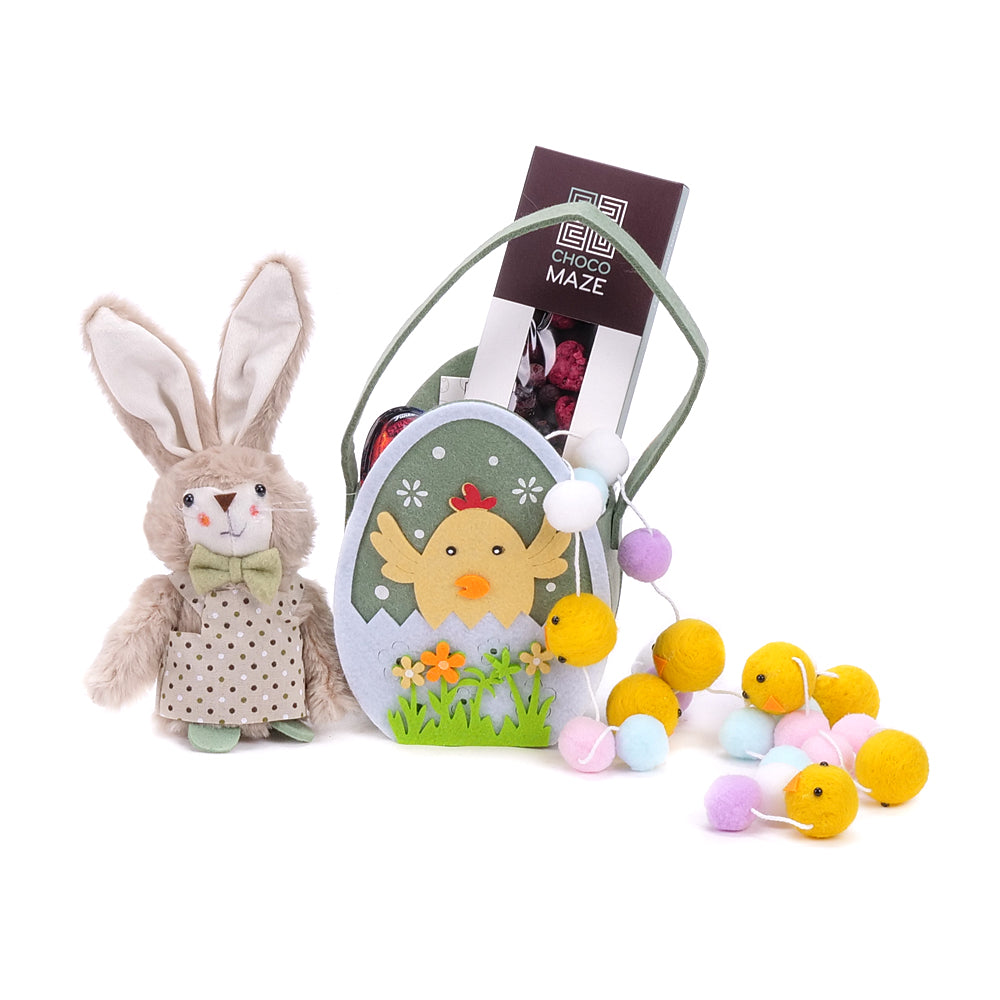 Veľkonočný set s plyšovým zajačikom, mini taškou z flizelínu, vajíčkom kinder joy, veľkonočnou ozdobnou reťazou a ručne robenou čokoládou so sušeným ovocím. Čítať viac